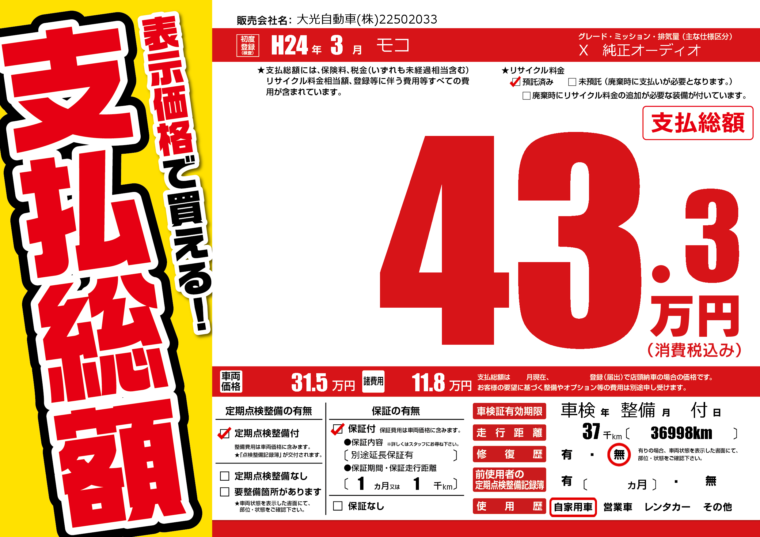 | 走行キロ | 3.7万km | 初年度登録 | H24年3月 |