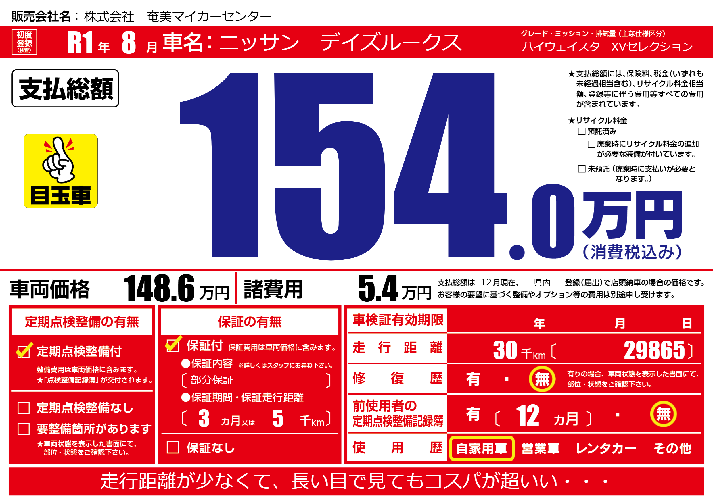 | 走行キロ | 3万km | 初年度登録 | R1年8月 |