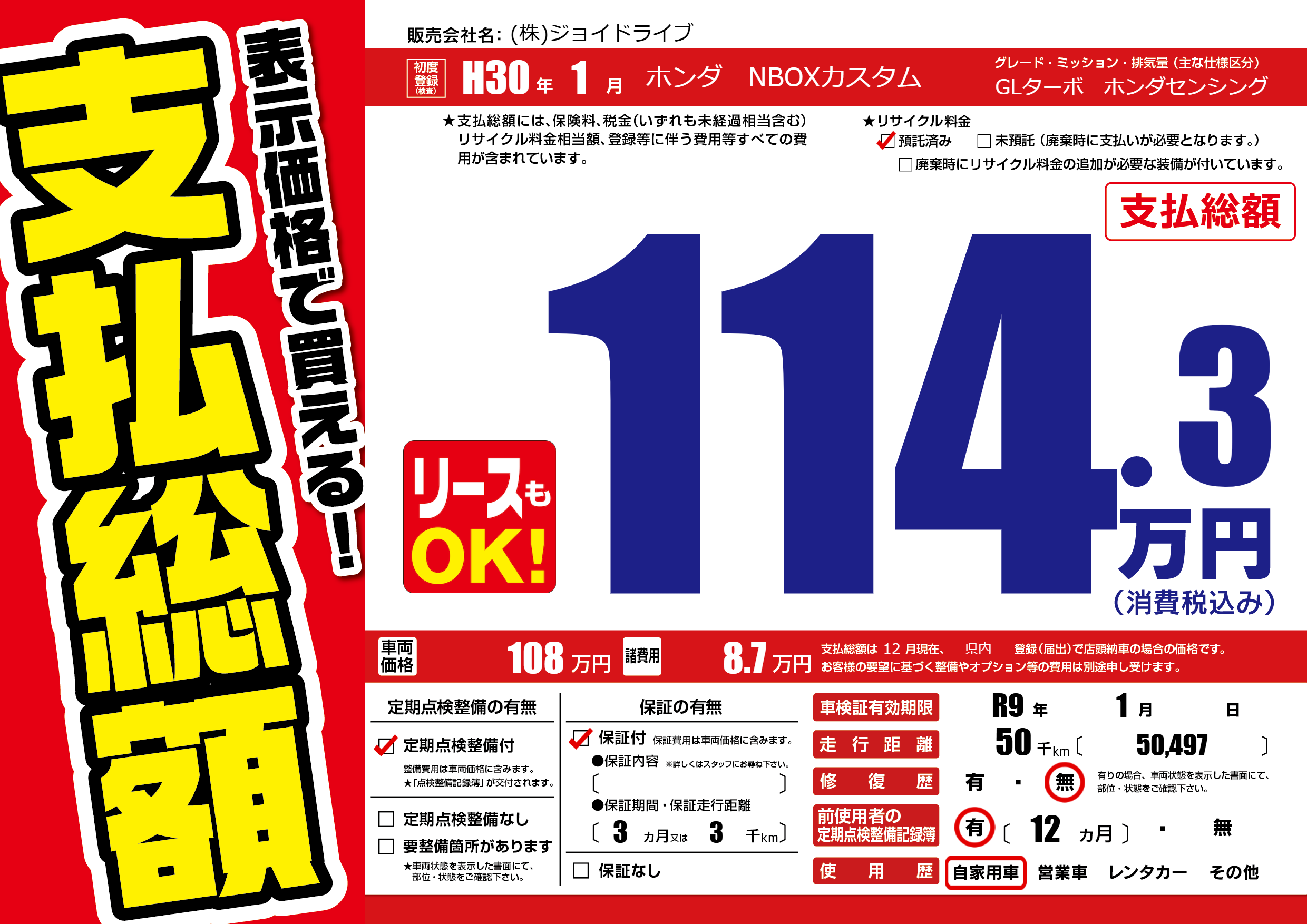 | 走行キロ | 5万km | 初年度登録 | H30年1月 |
