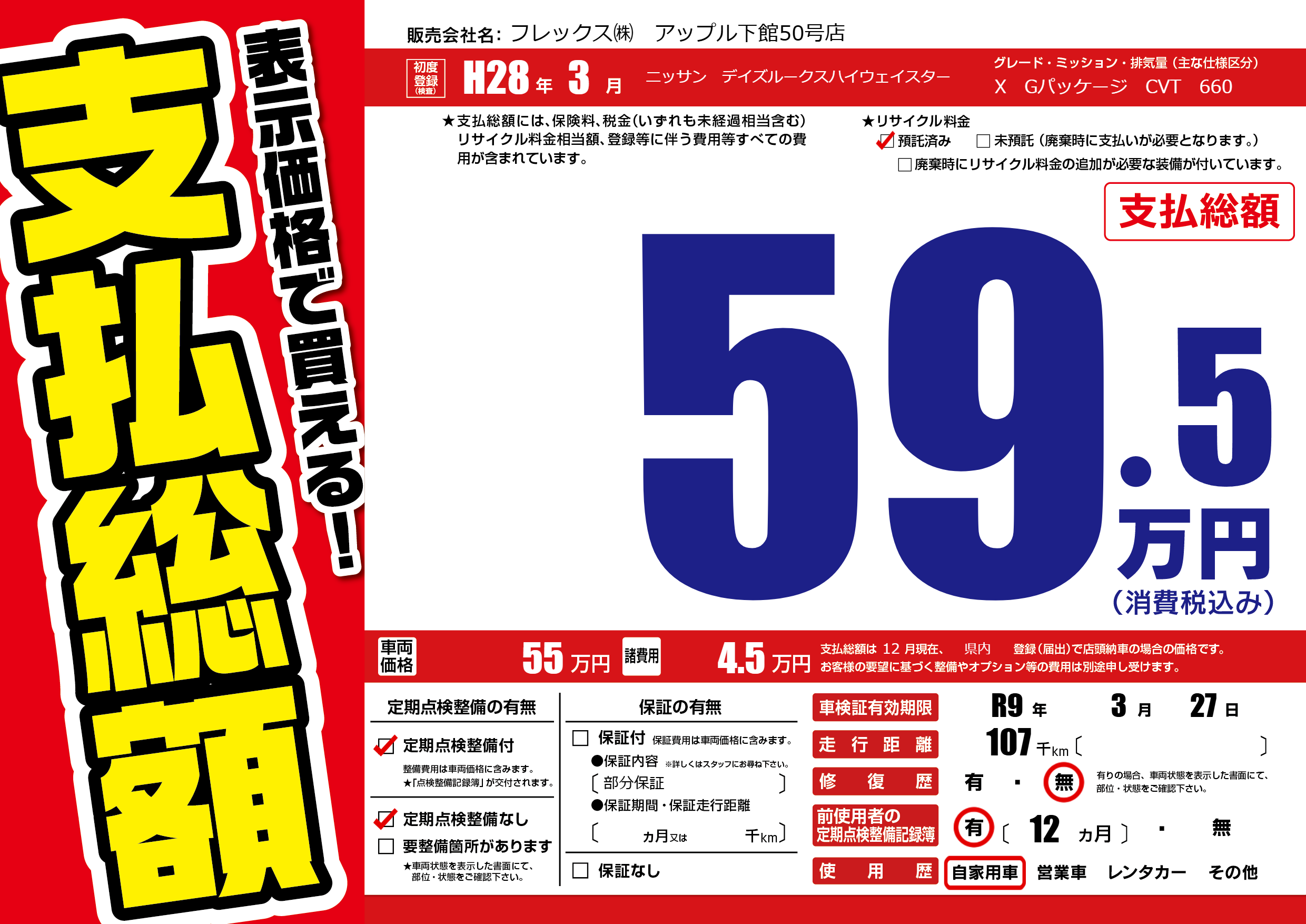 | 車名 | ニッサン デイズルークスハイウェイスター | グレード ミッション 排気量 |
