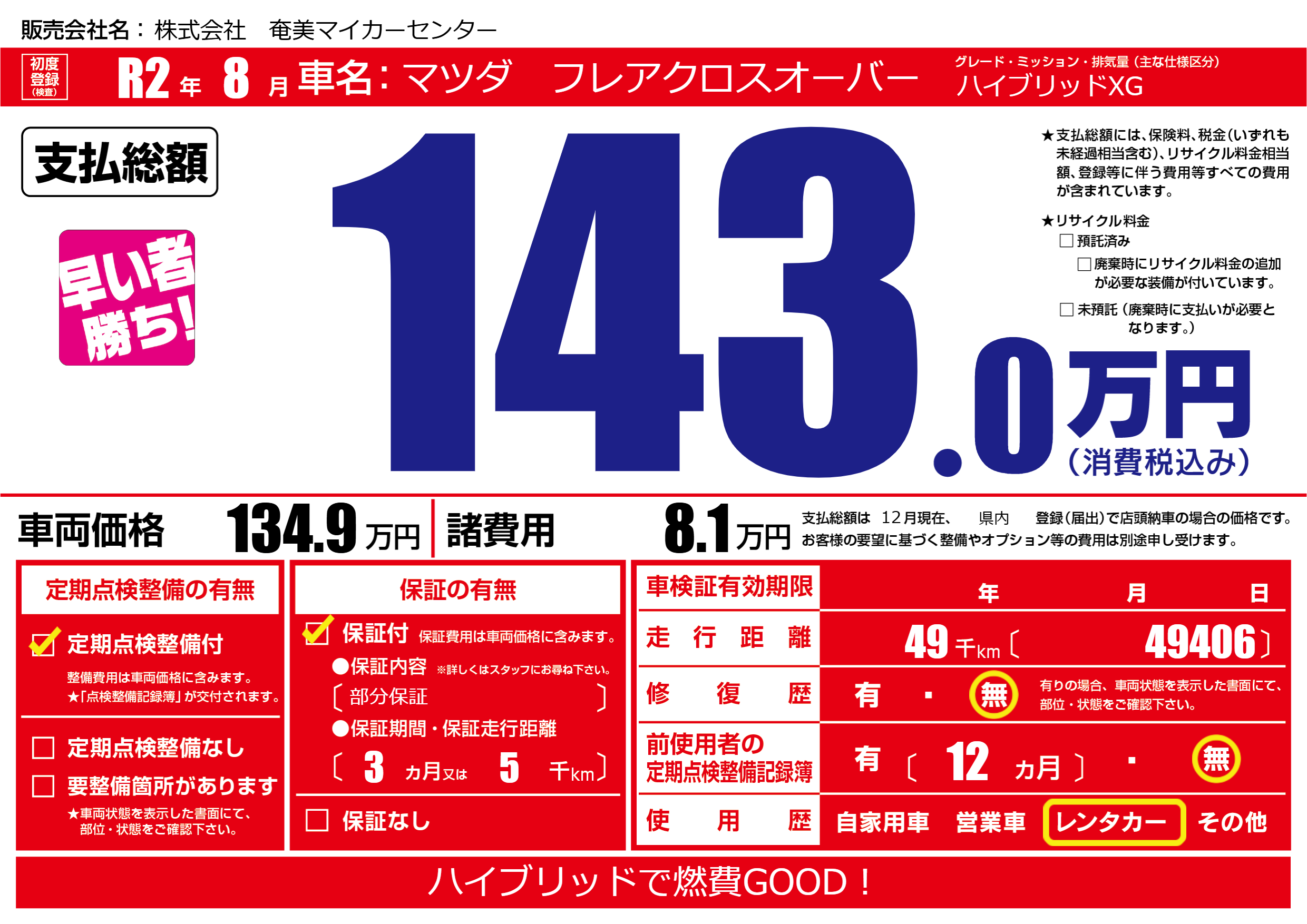 | 走行キロ | 4.9万km | 初年度登録 | R2年8月 |
