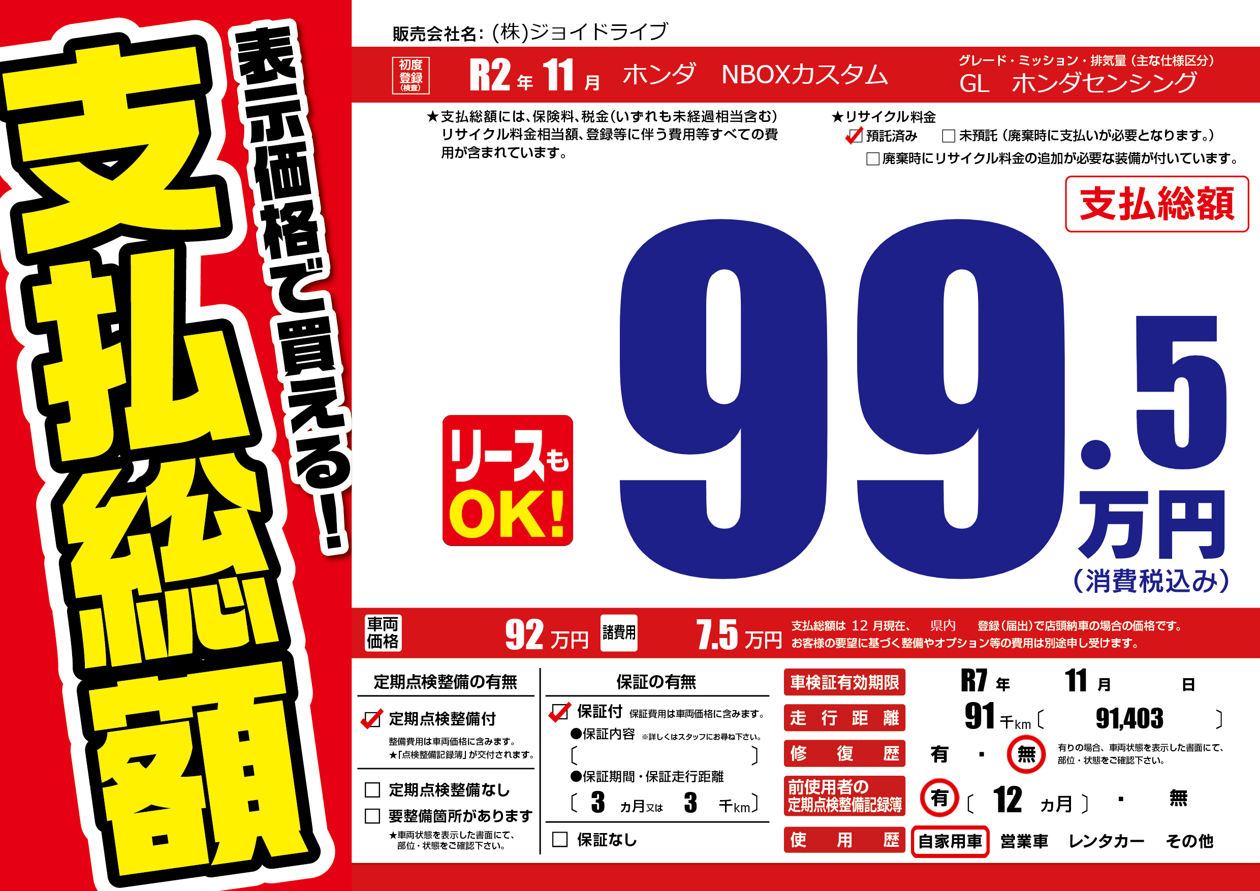 保証付き 保証内容(---) 3ヶ月または(3)千kmまで |