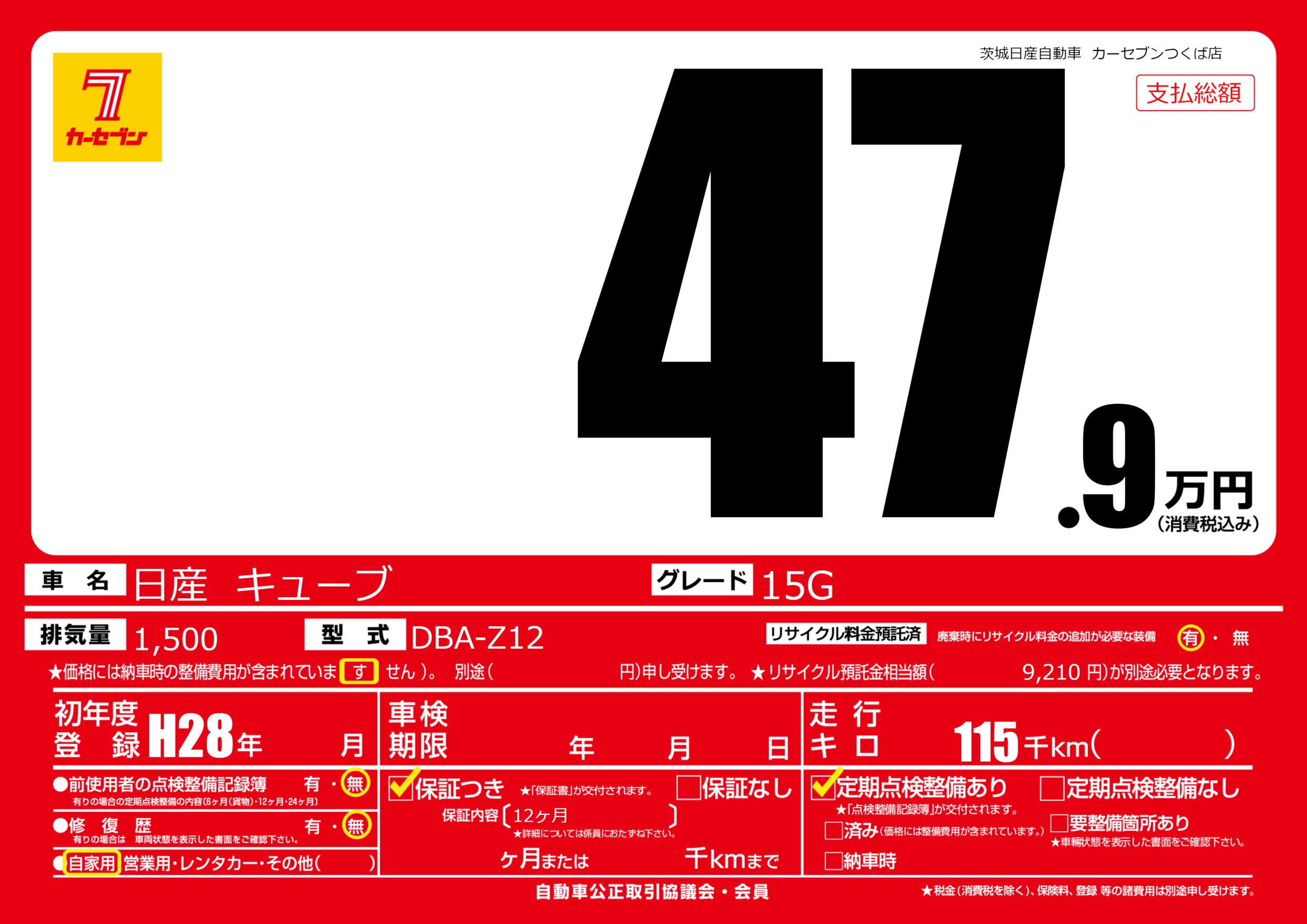 | 車名 | 日産 キューブ | グレード ミッション 排気量 |