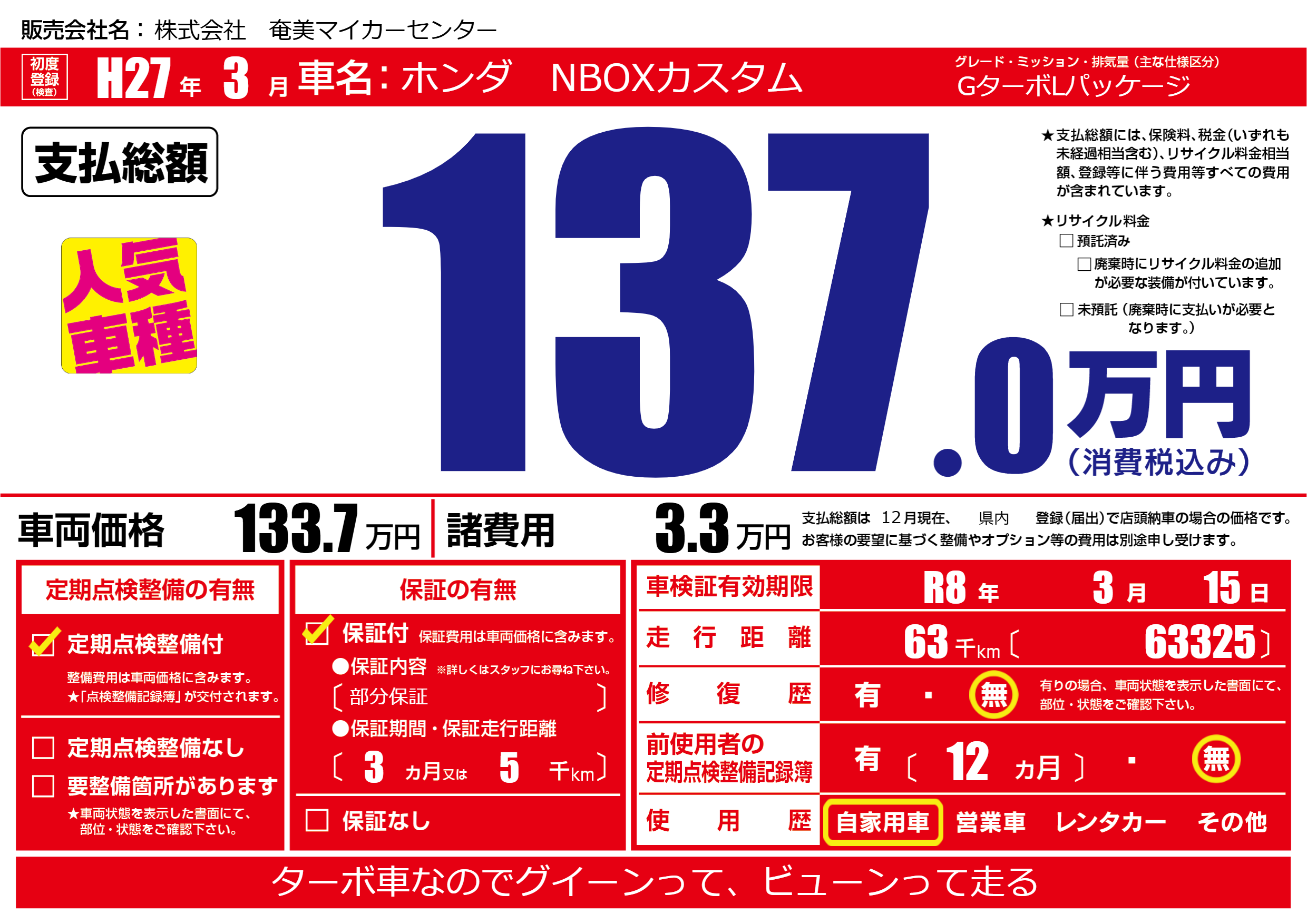 | 走行キロ | 6.3万km | 初年度登録 | H27年3月 |