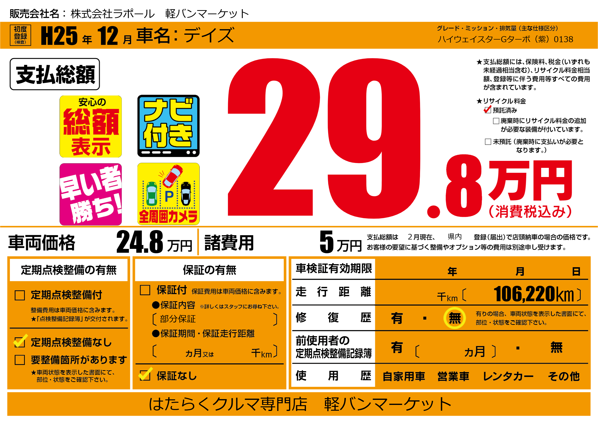 | 走行キロ | - | 初年度登録 | H25年12月 |