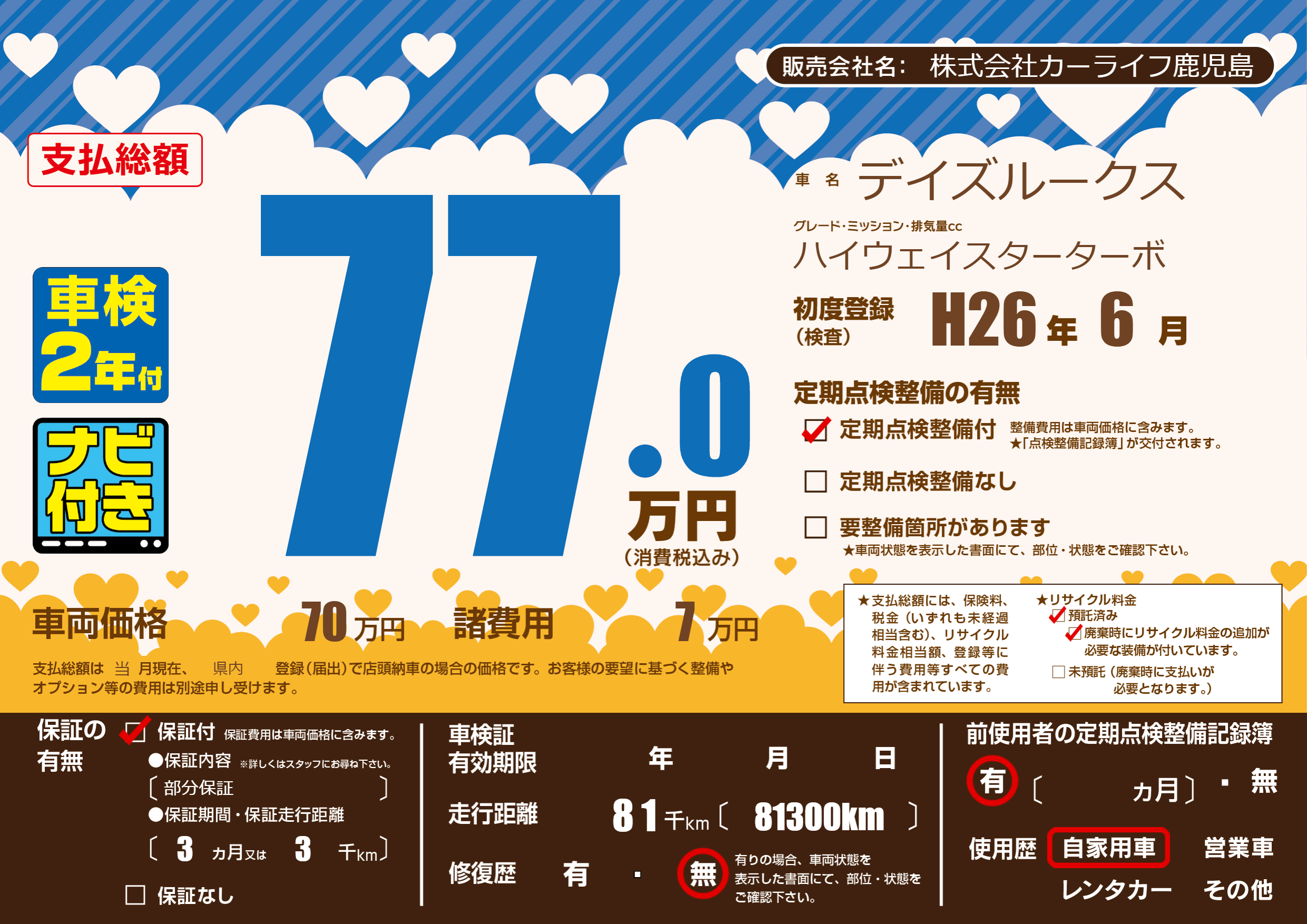 | 走行キロ | 0.8万km | 初年度登録 | H26年6月 |