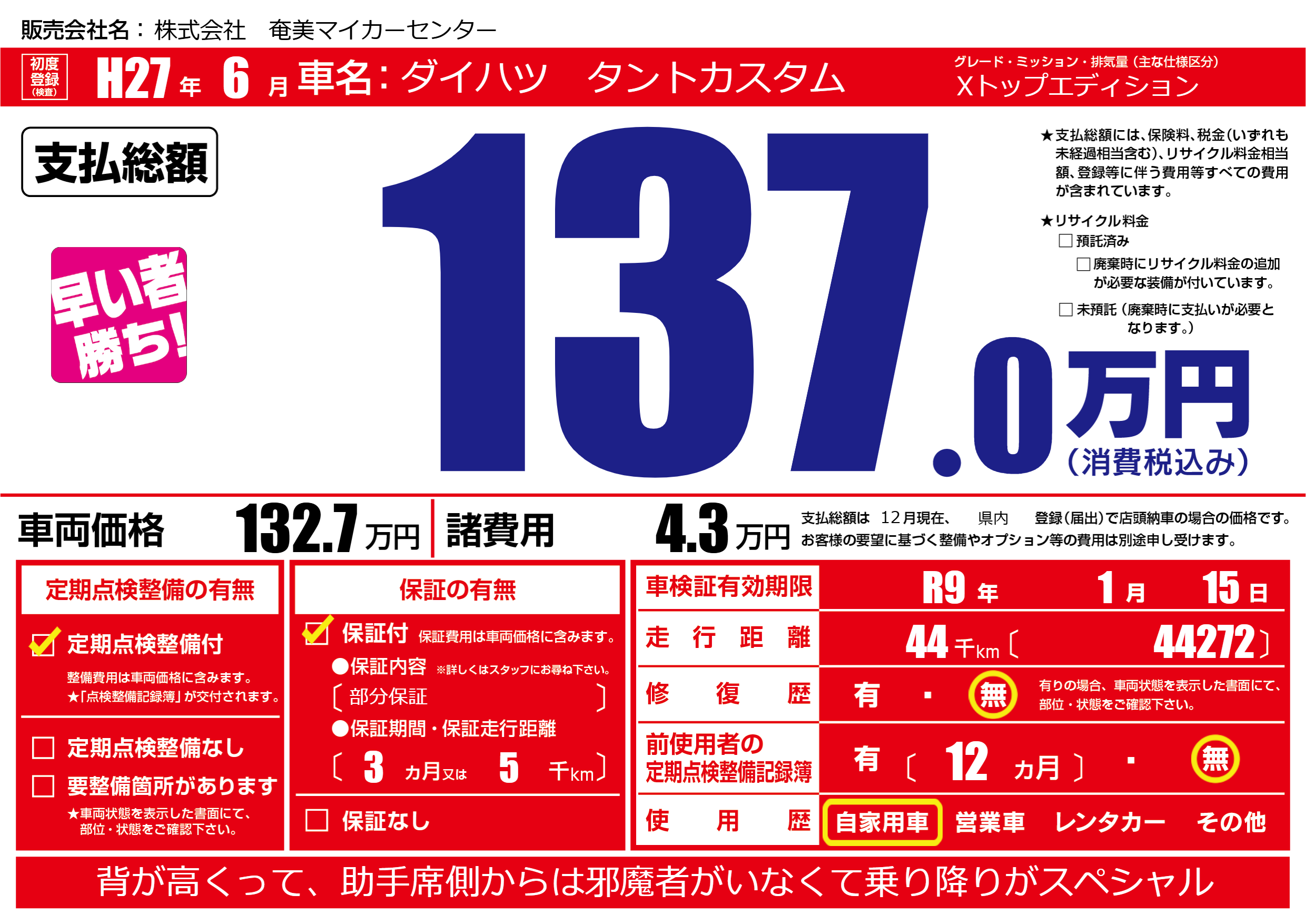 | 車検制限 | R9年 1月 15日 | ||
