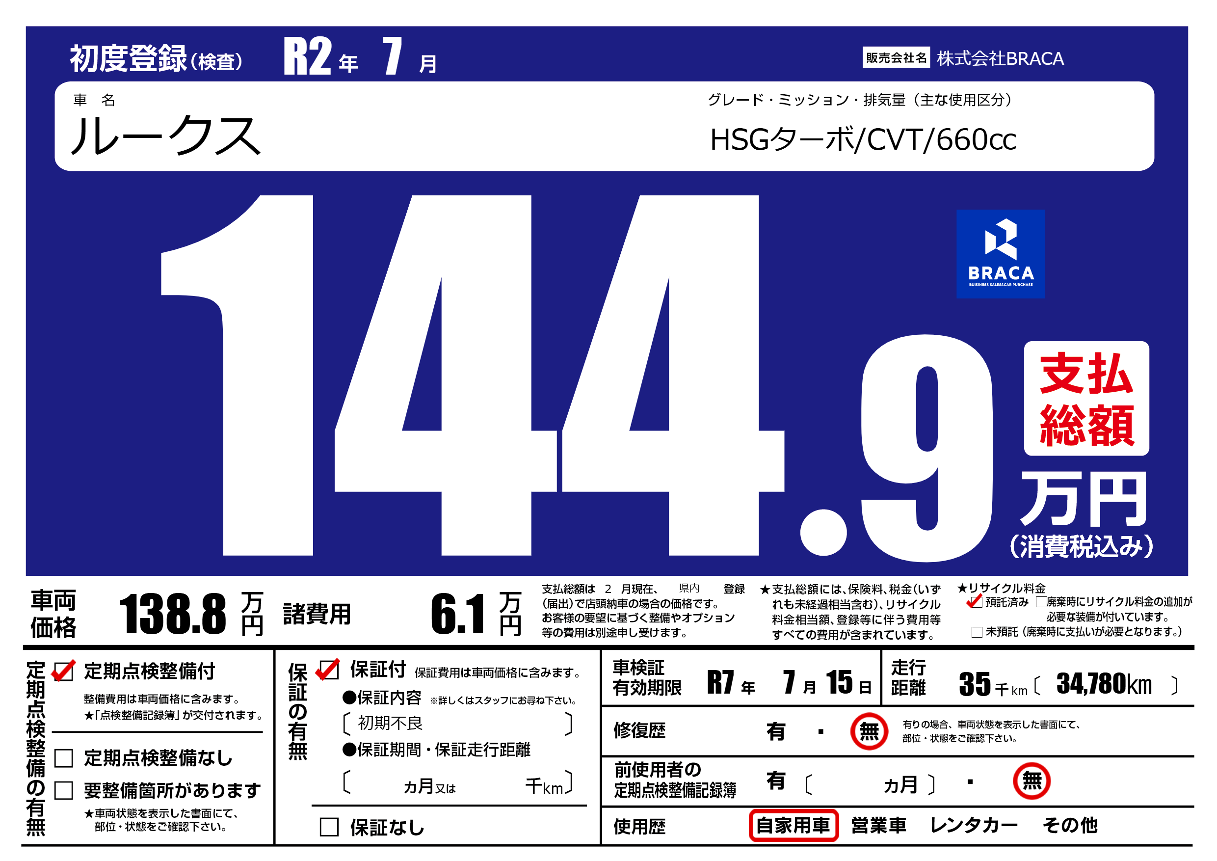 | 車検制限 | R7年 7月 15日 | ||
