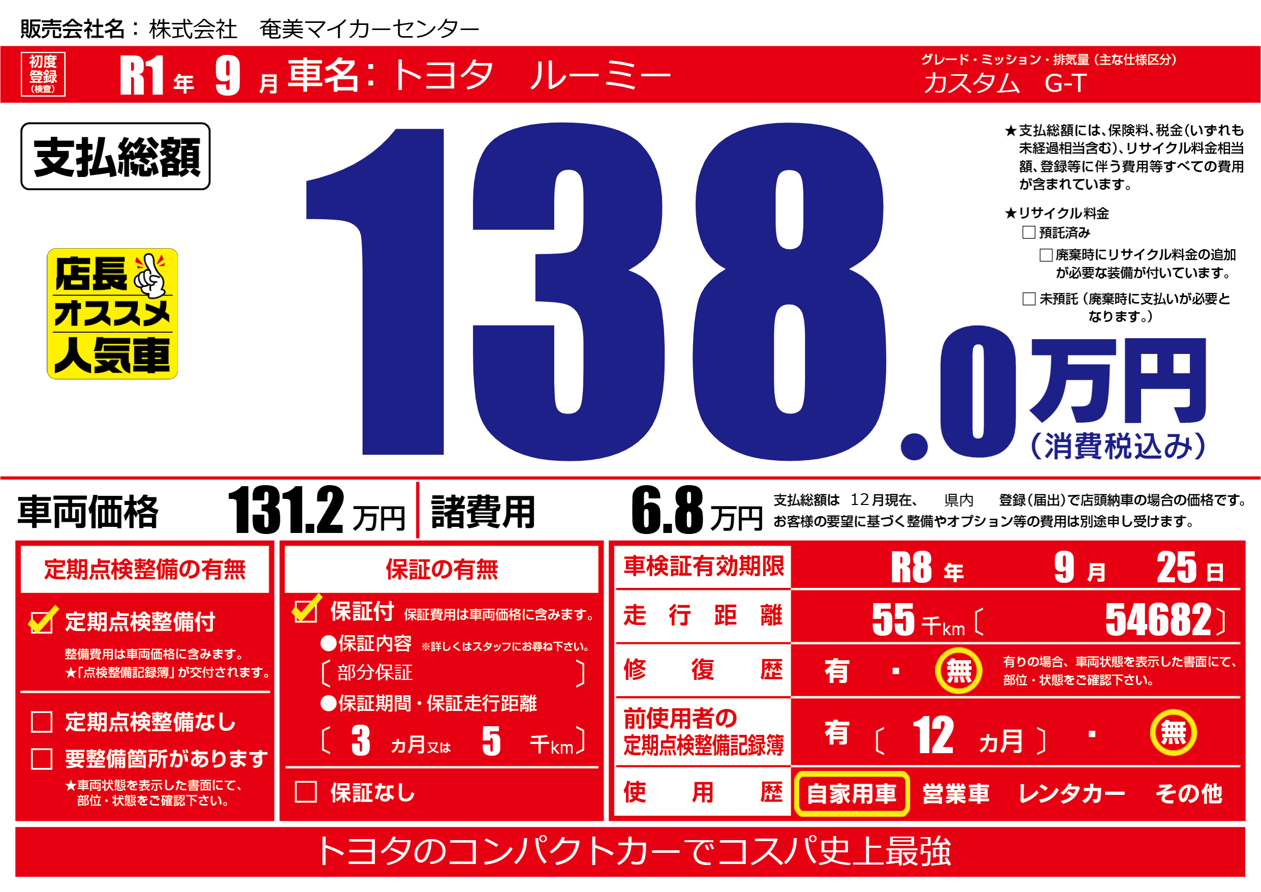 | 車名 | トヨタ ルーミー | グレード ミッション 排気量 |