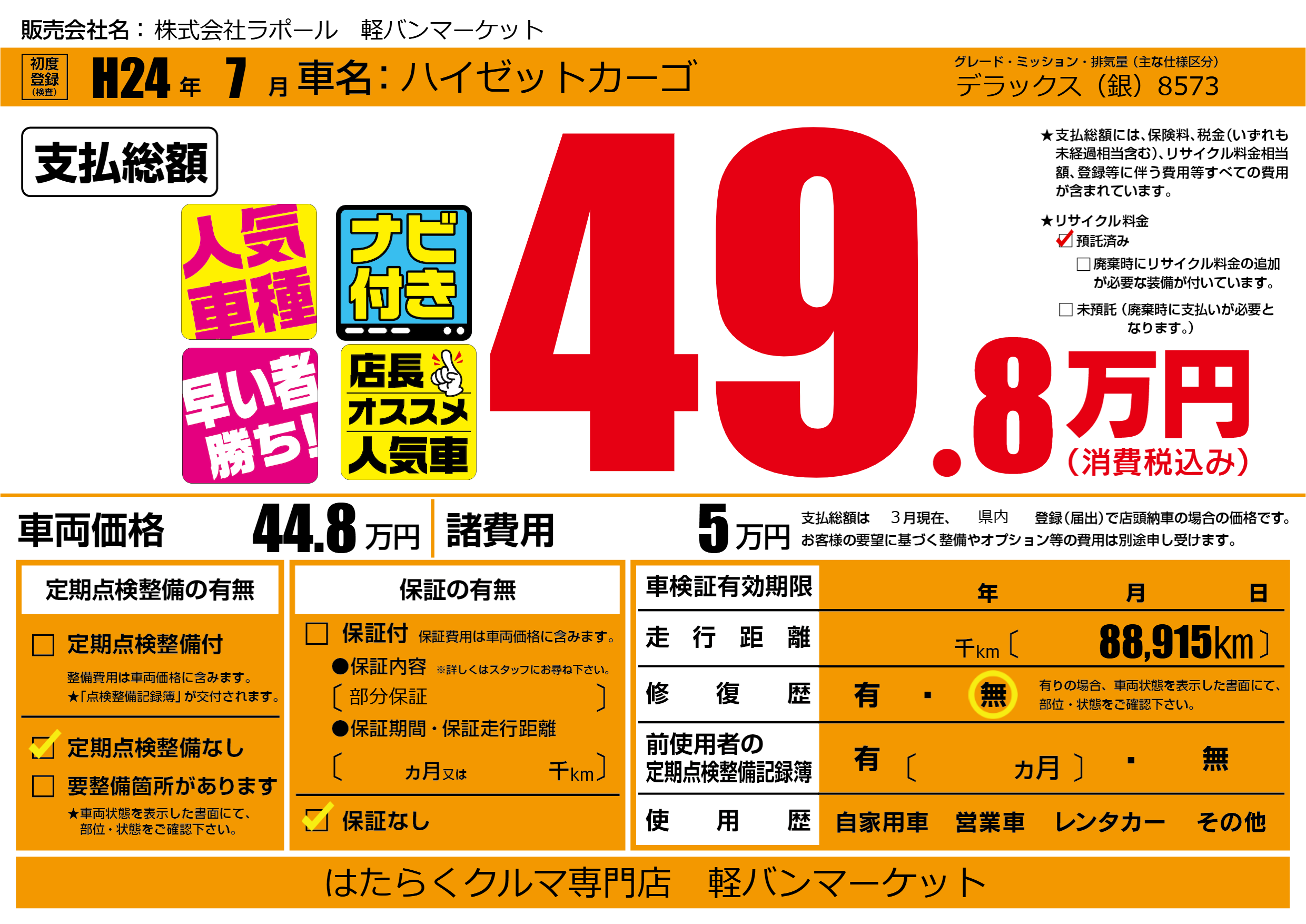 | 車名 | ハイゼットカーゴ | グレード ミッション 排気量 |