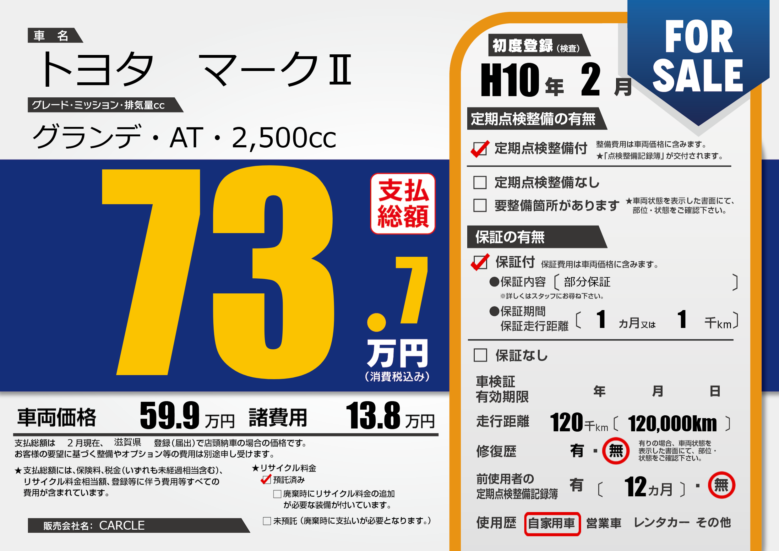 | 走行キロ | 12万km | 初年度登録 | H10年2月 |