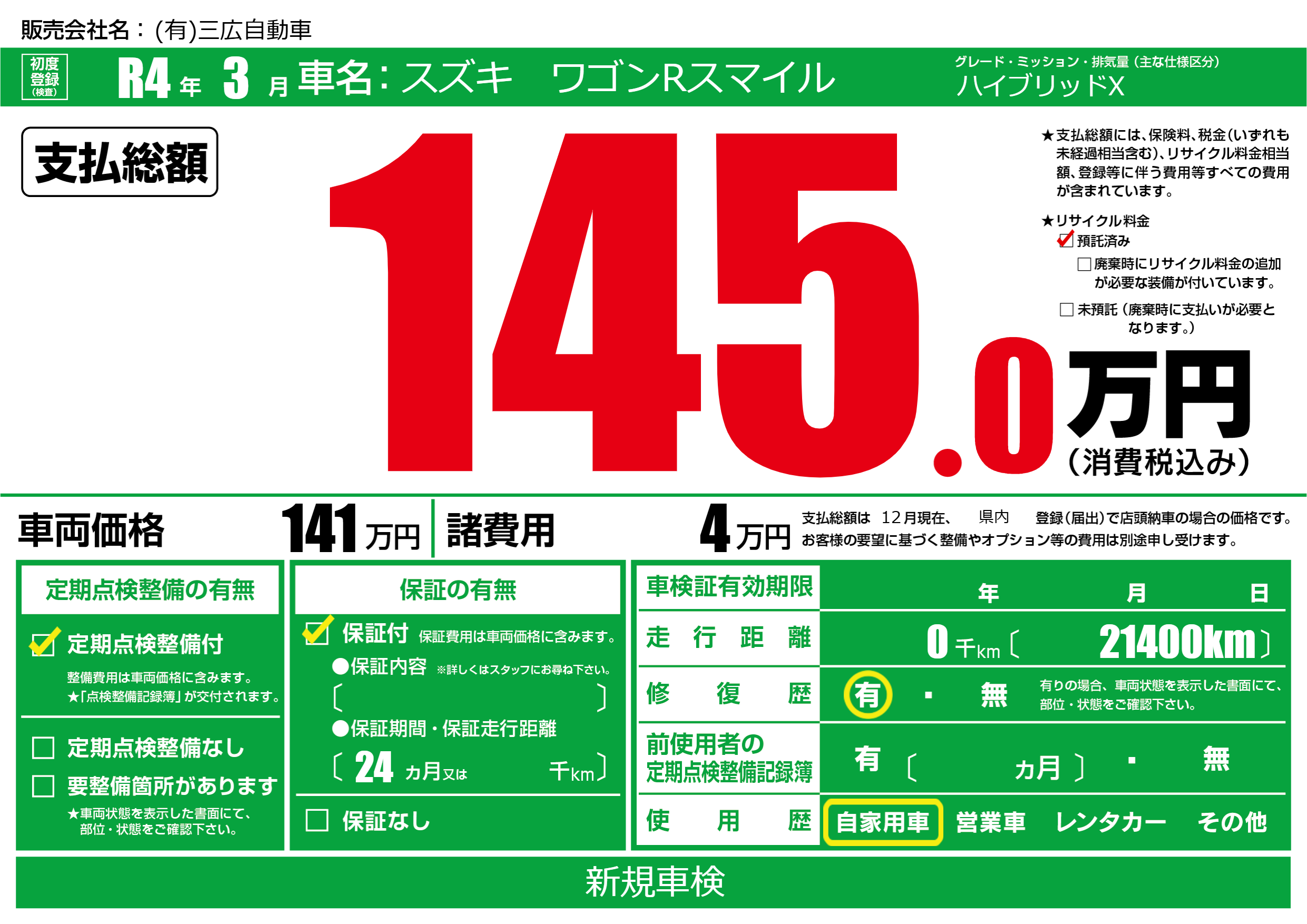 | 車名 | スズキ ワゴンRスマイル | グレード ミッション 排気量 |