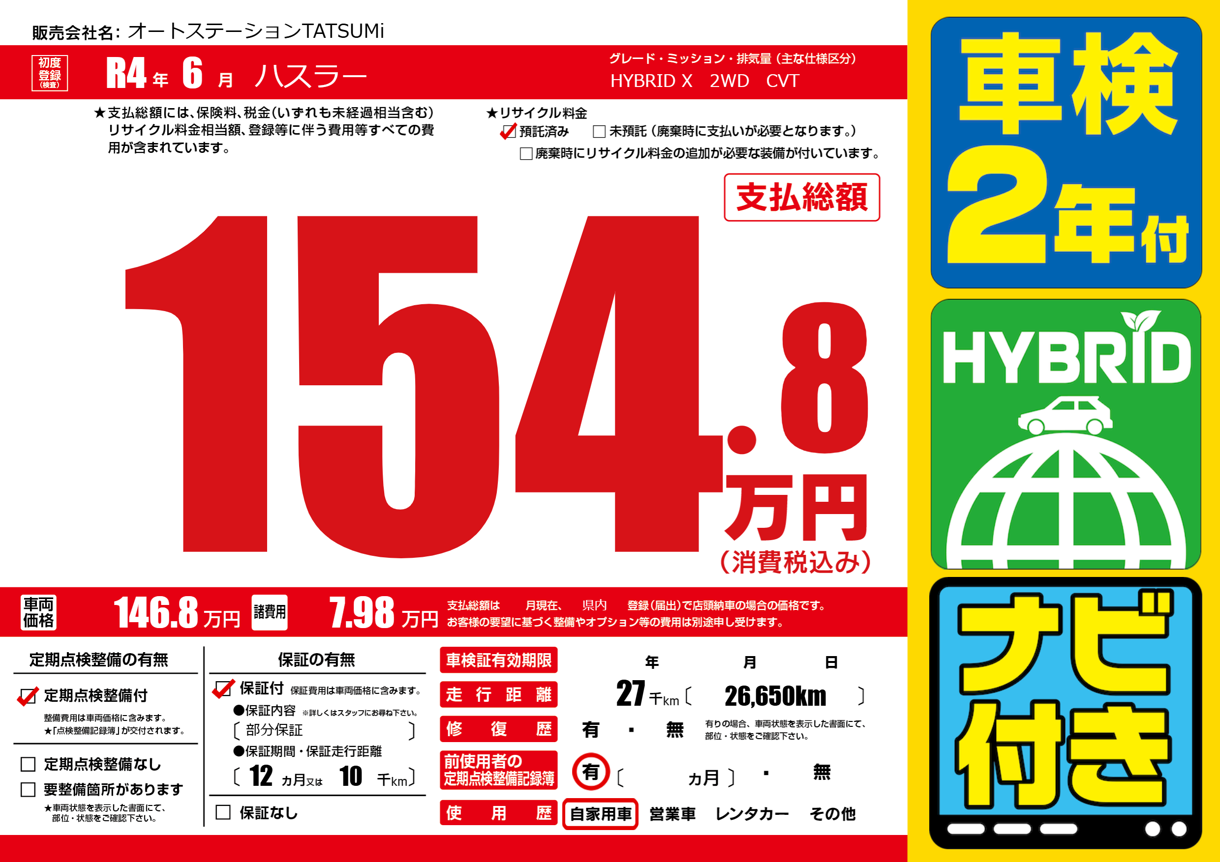 | 車名 | ハスラー | グレード ミッション 排気量 |