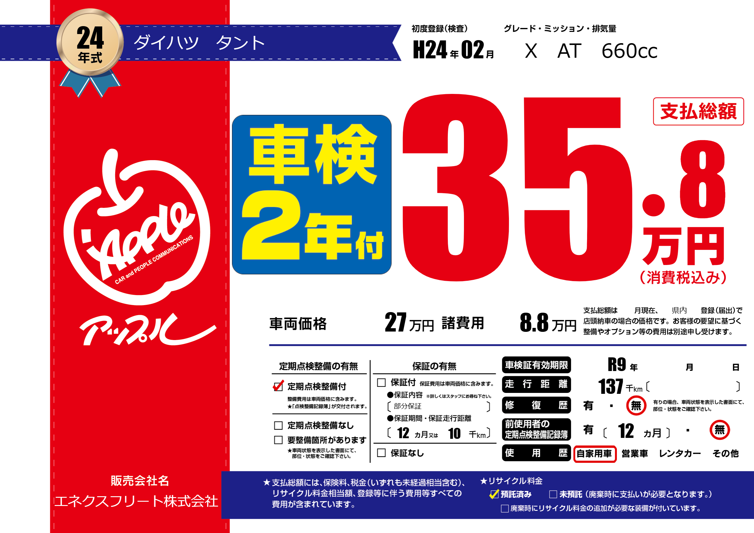 | 車名 | ダイハツ タント | グレード ミッション 排気量 |