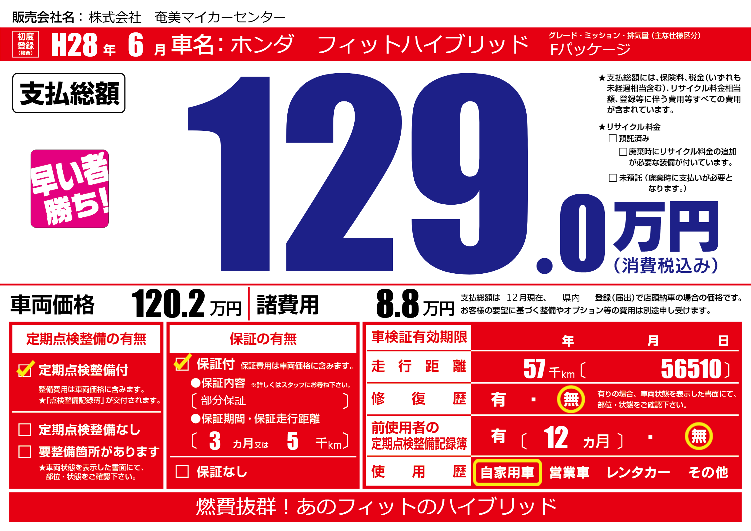 | 走行キロ | 5.7万km | 初年度登録 | H28年6月 |