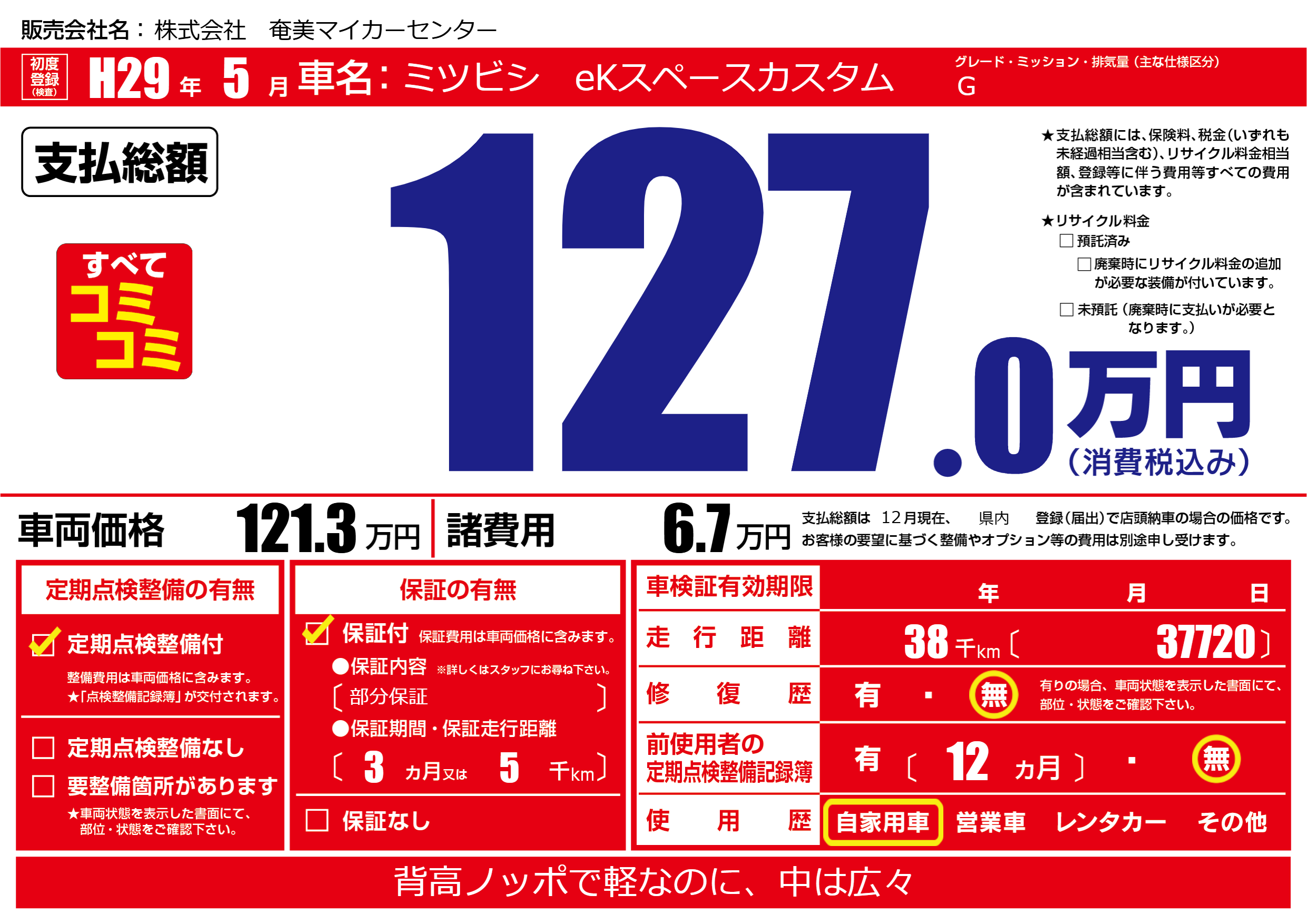 | 走行キロ | 3.8万km | 初年度登録 | H29年5月 |