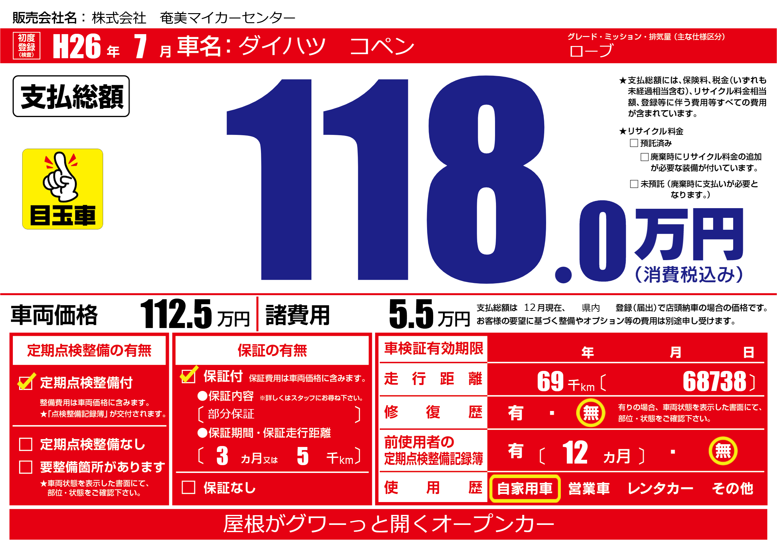 | 車名 | ダイハツ コペン | グレード ミッション 排気量 |