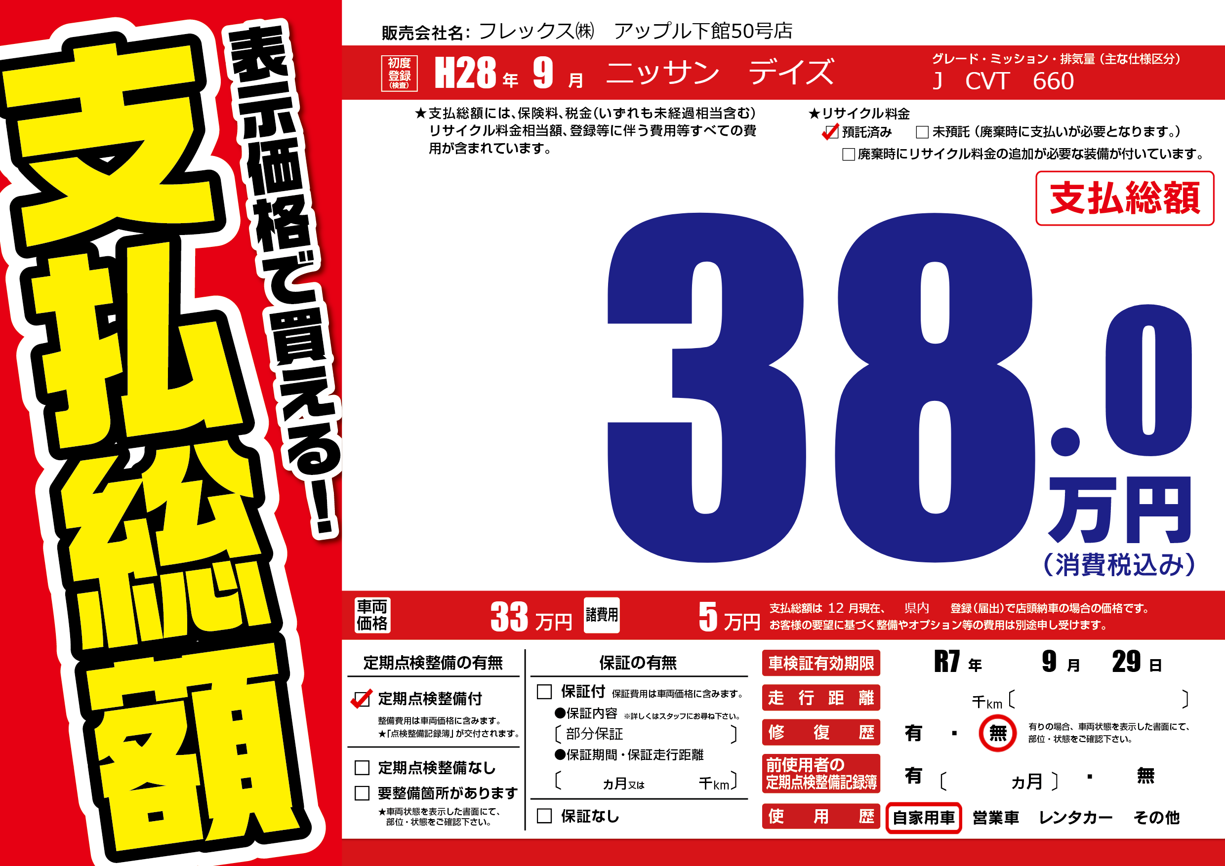 | 車名 | ニッサン デイズ | グレード ミッション 排気量 |