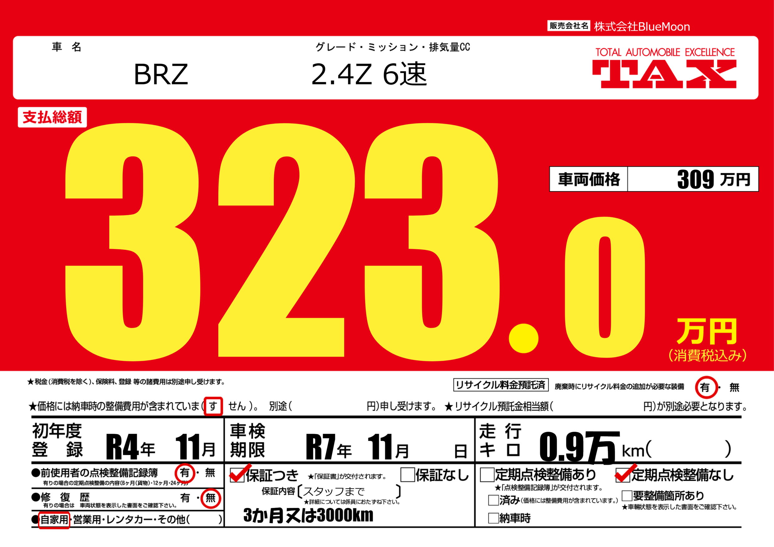 | 車名 | BRZ | グレード ミッション 排気量 |