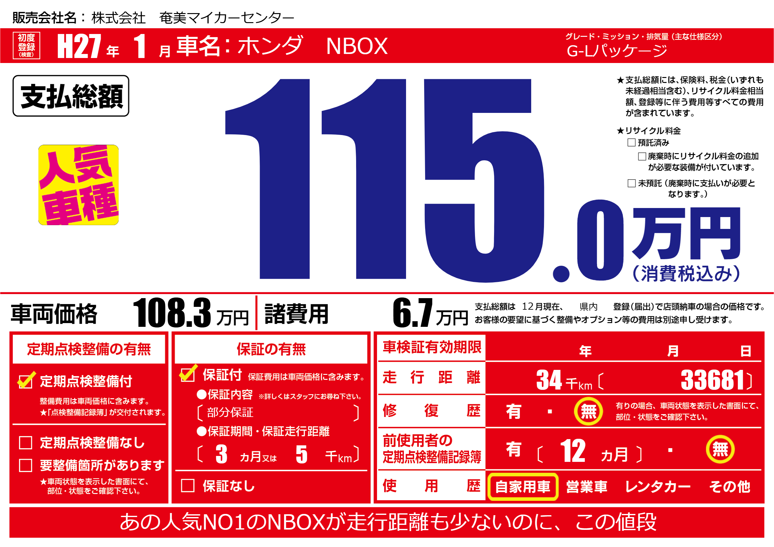 | 走行キロ | 3.4万km | 初年度登録 | H27年1月 |