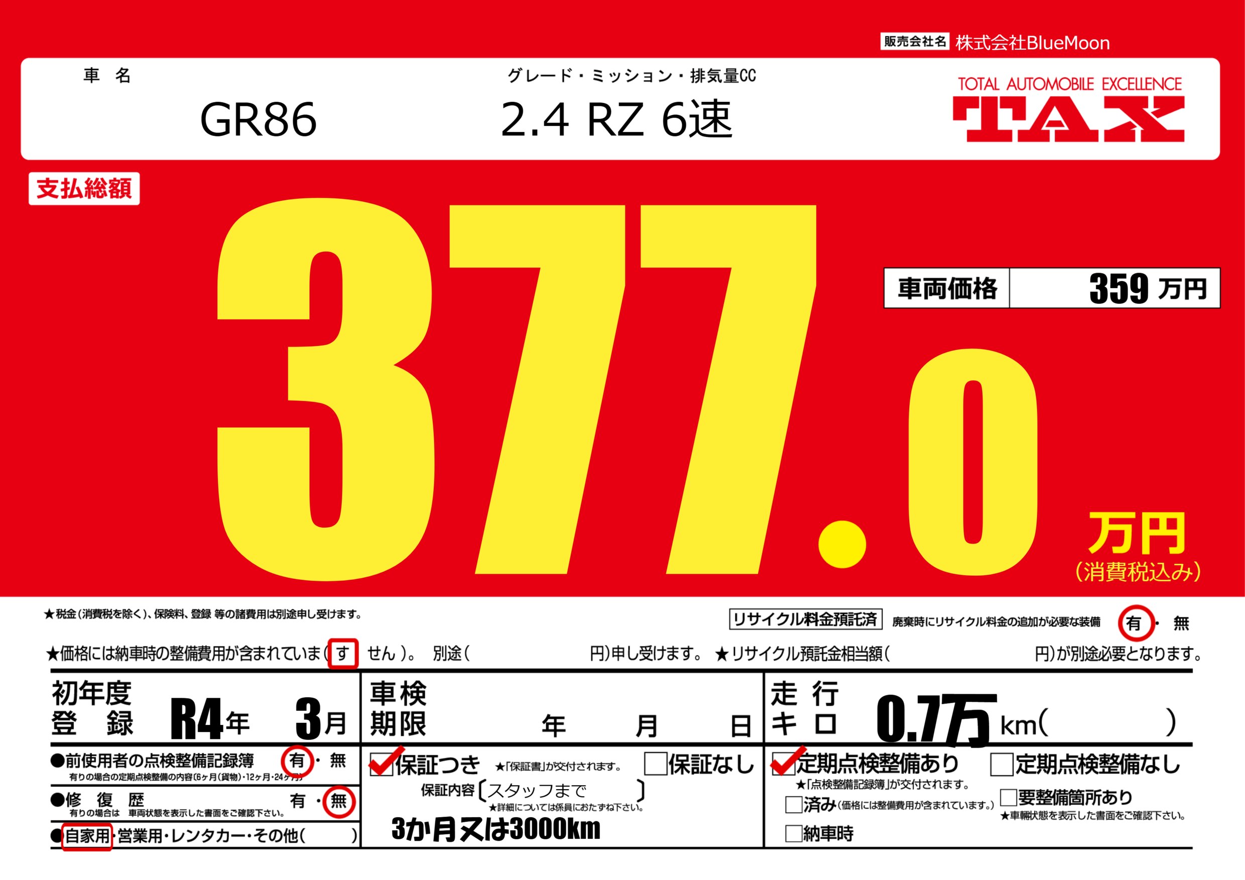 | 車名 | GR86 | グレード ミッション 排気量 |
