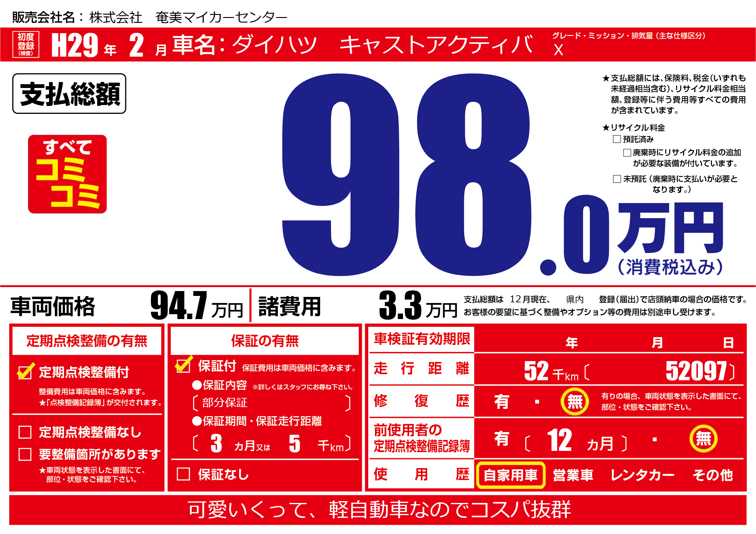 保証付き 保証内容(部分保証) 3ヶ月または(5)千kmまで |