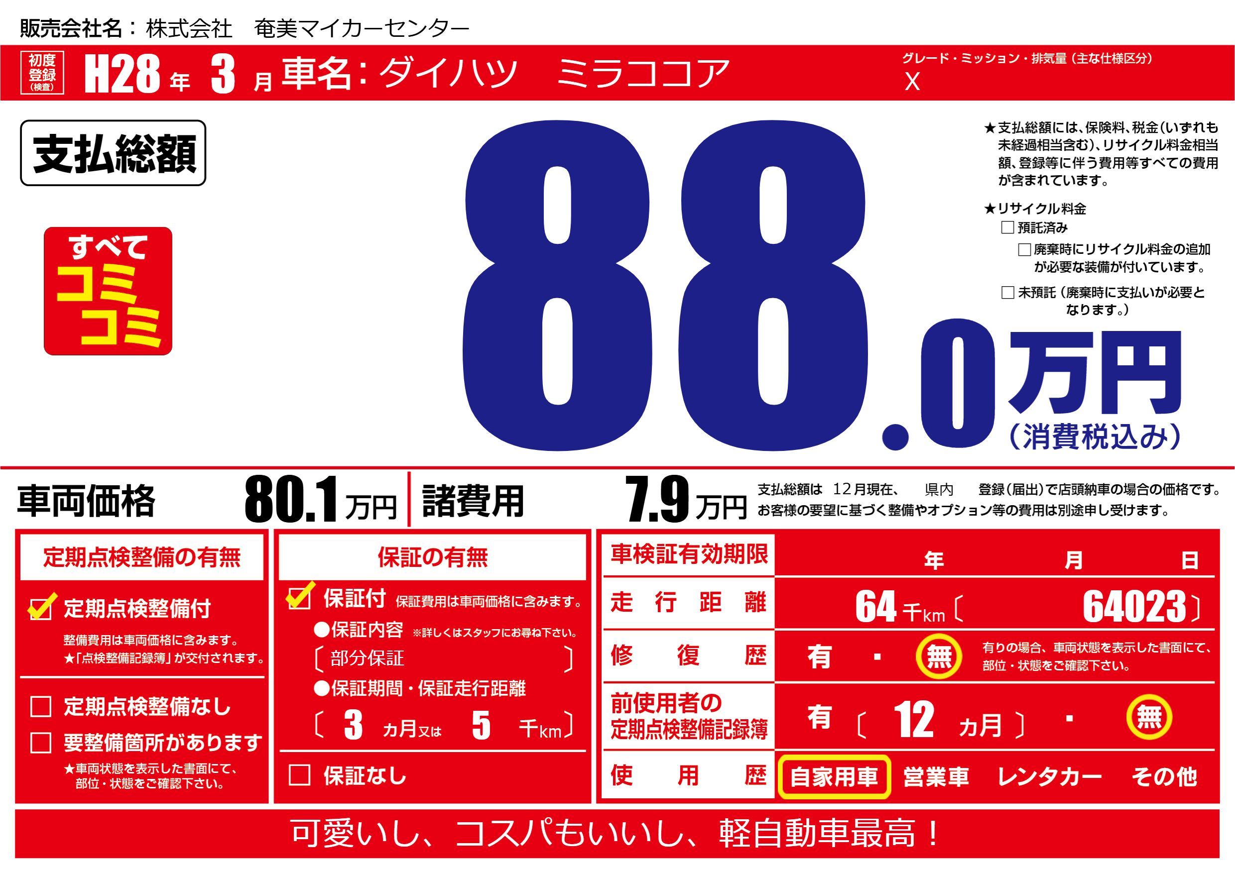| 車名 | ダイハツ ミラココア | グレード ミッション 排気量 |