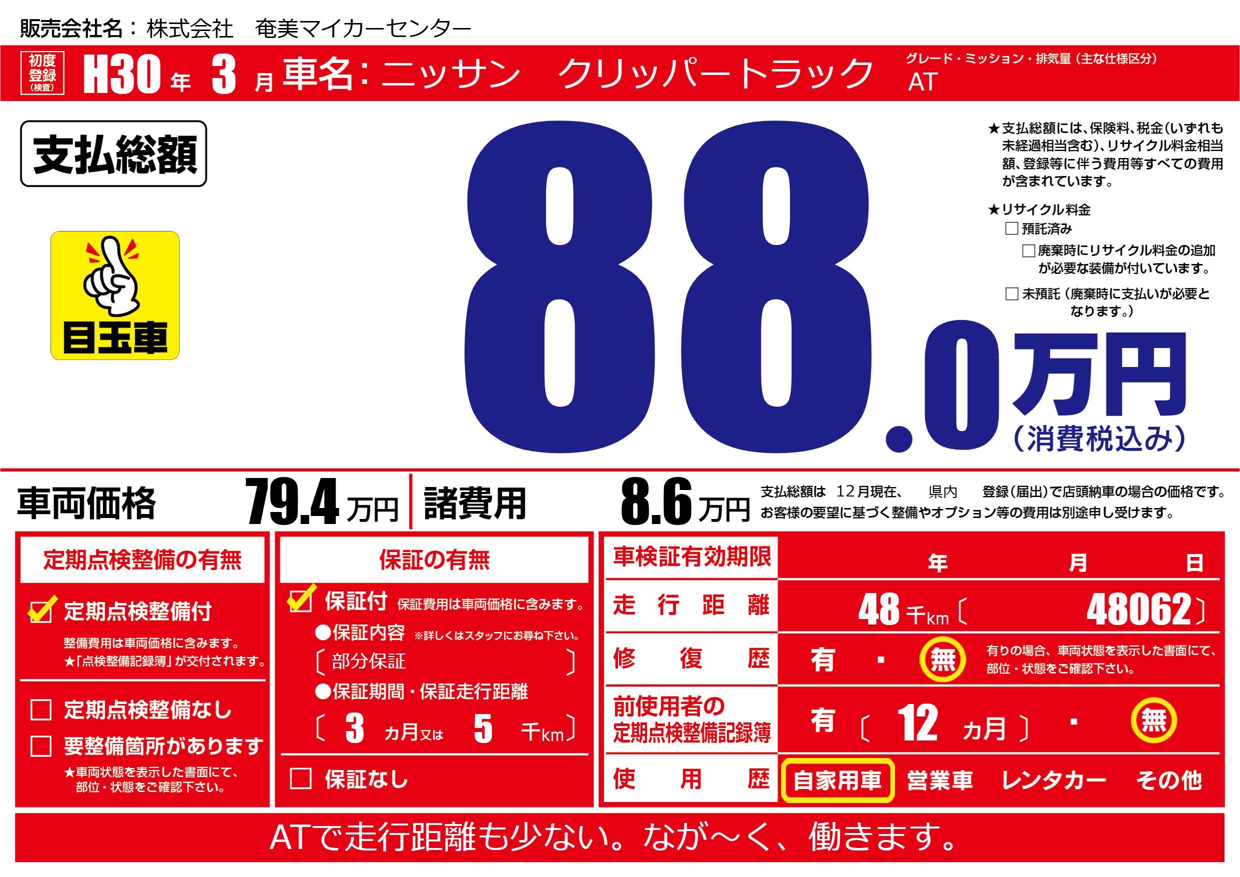 | 車名 | ニッサン クリッパートラック | グレード ミッション 排気量 |