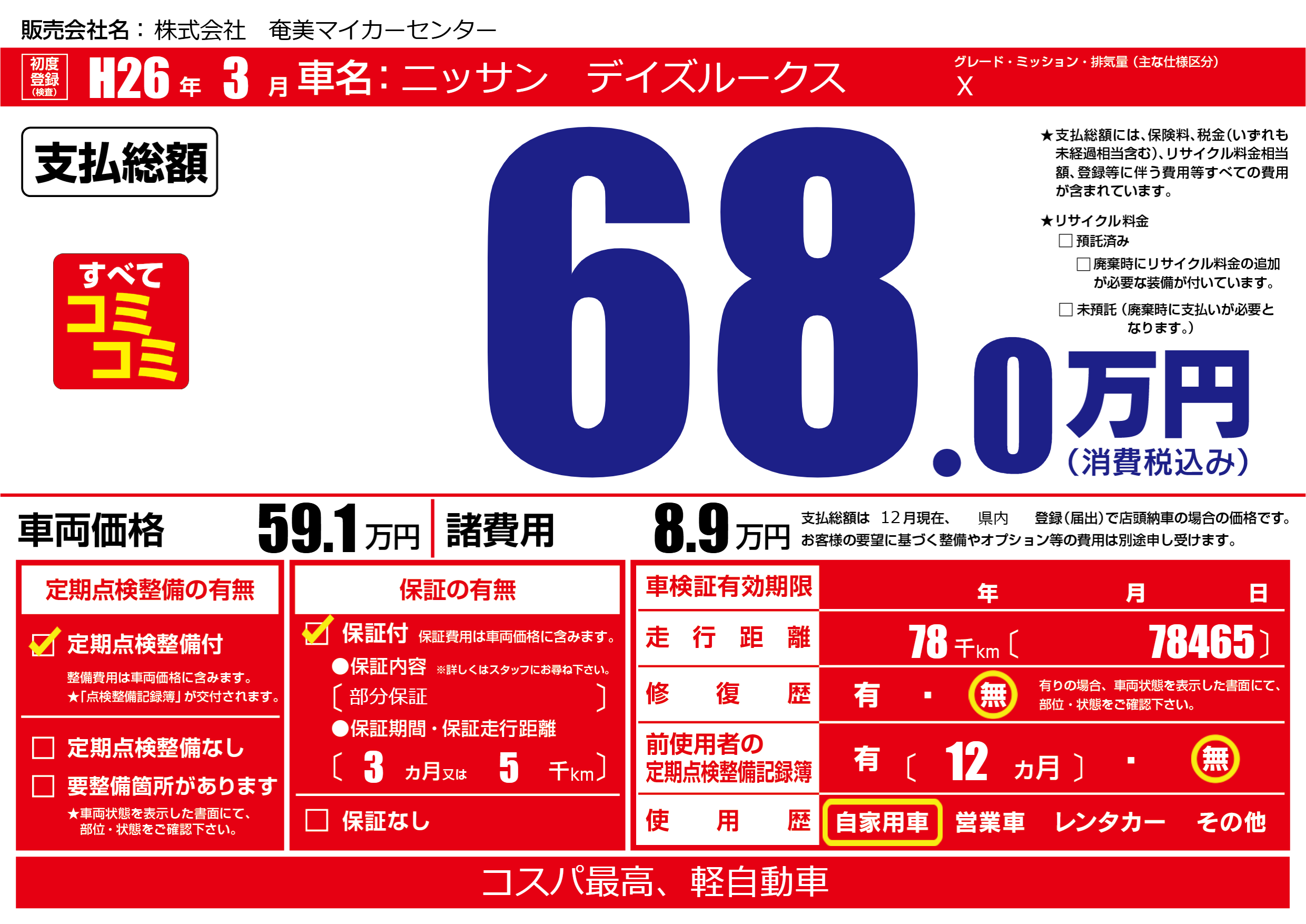 | 走行キロ | 7.8万km | 初年度登録 | H26年3月 |