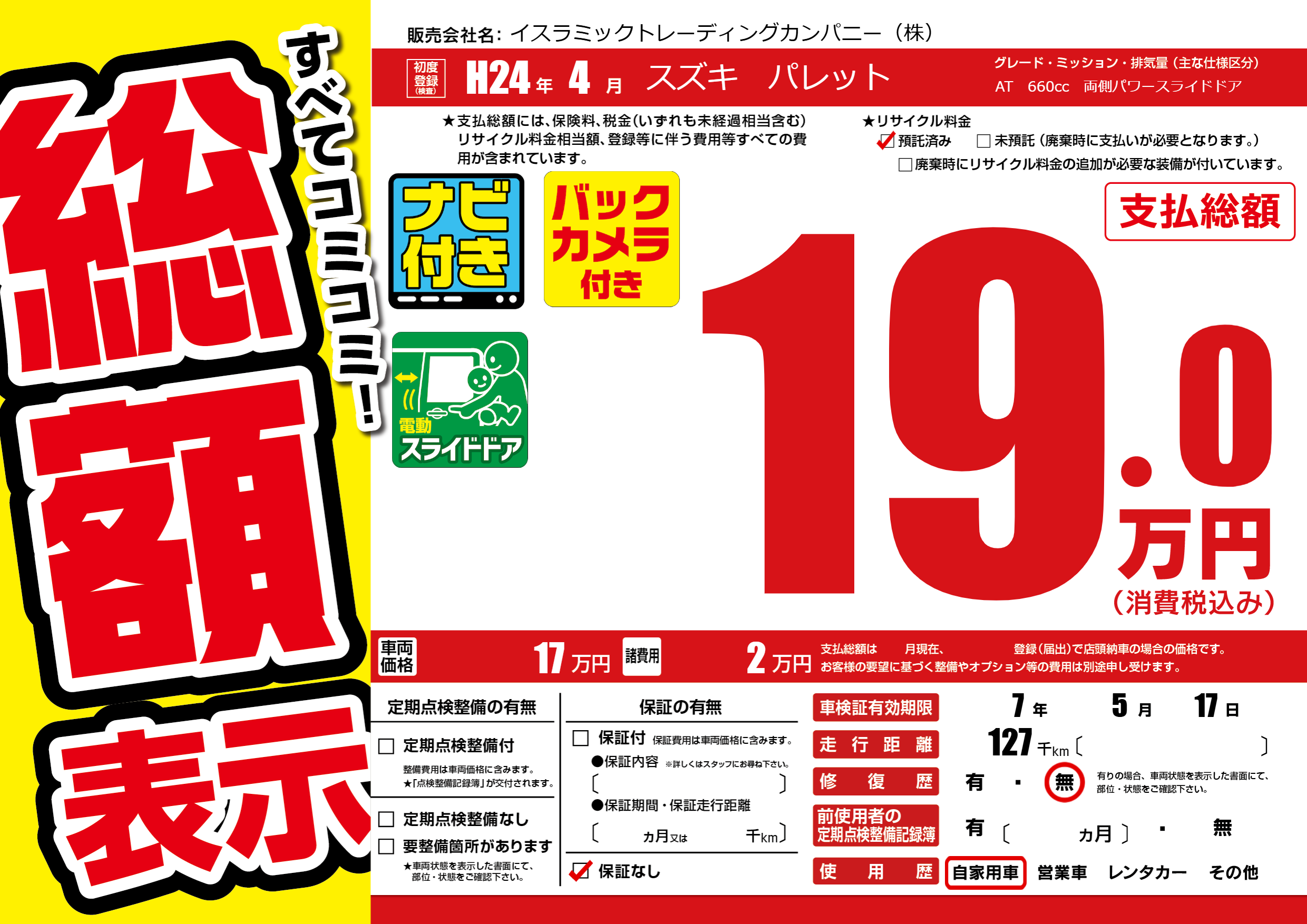 | 車名 | スズキ パレット | グレード ミッション 排気量 |