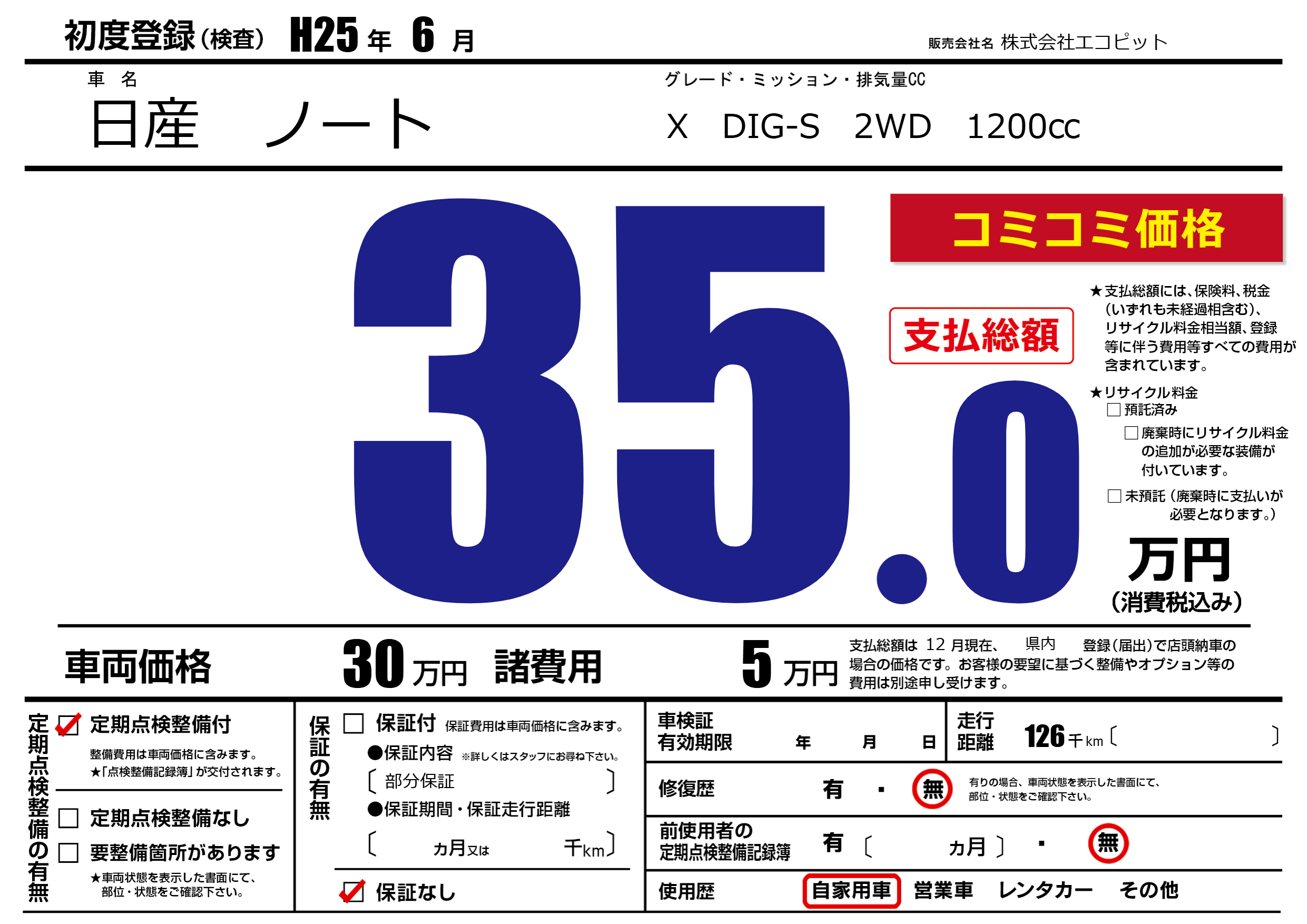 | 走行キロ | 12.6万km | 初年度登録 | H25年6月 |