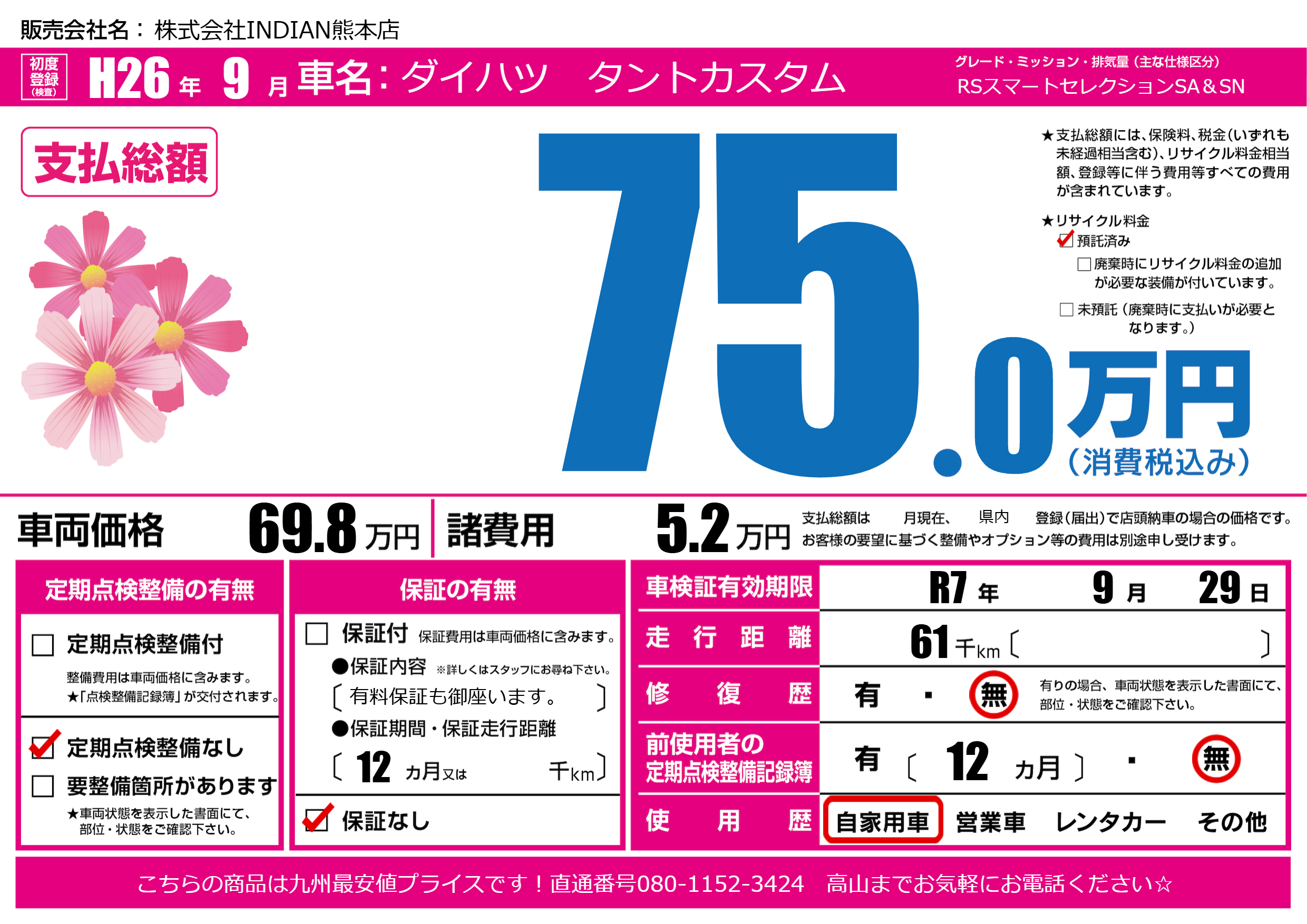 | 車検制限 | R7年 9月 29日 | ||