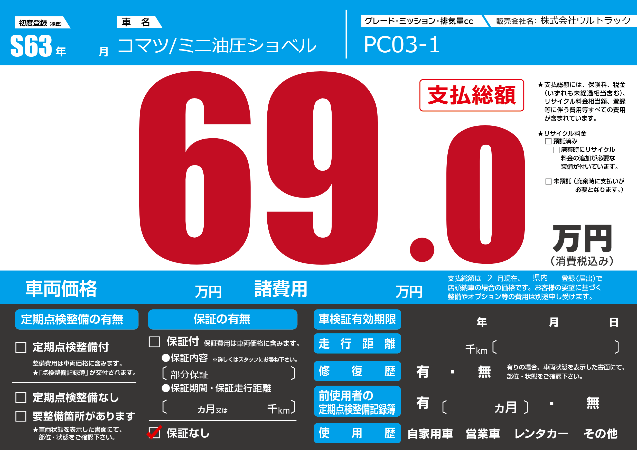 | 車名 | コマツ/ミニ油圧ショベル | グレード ミッション 排気量 |