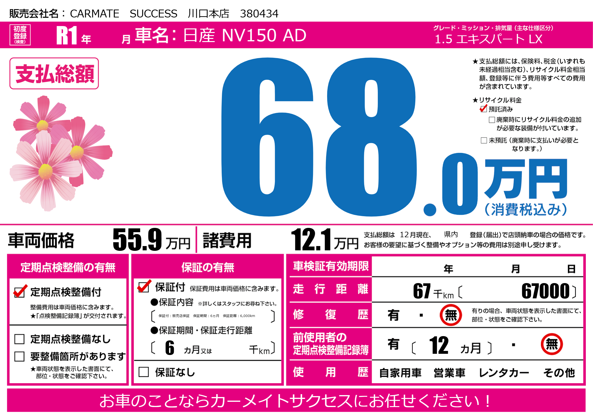 | 車名 | 日産 NV150 AD | グレード ミッション 排気量 |