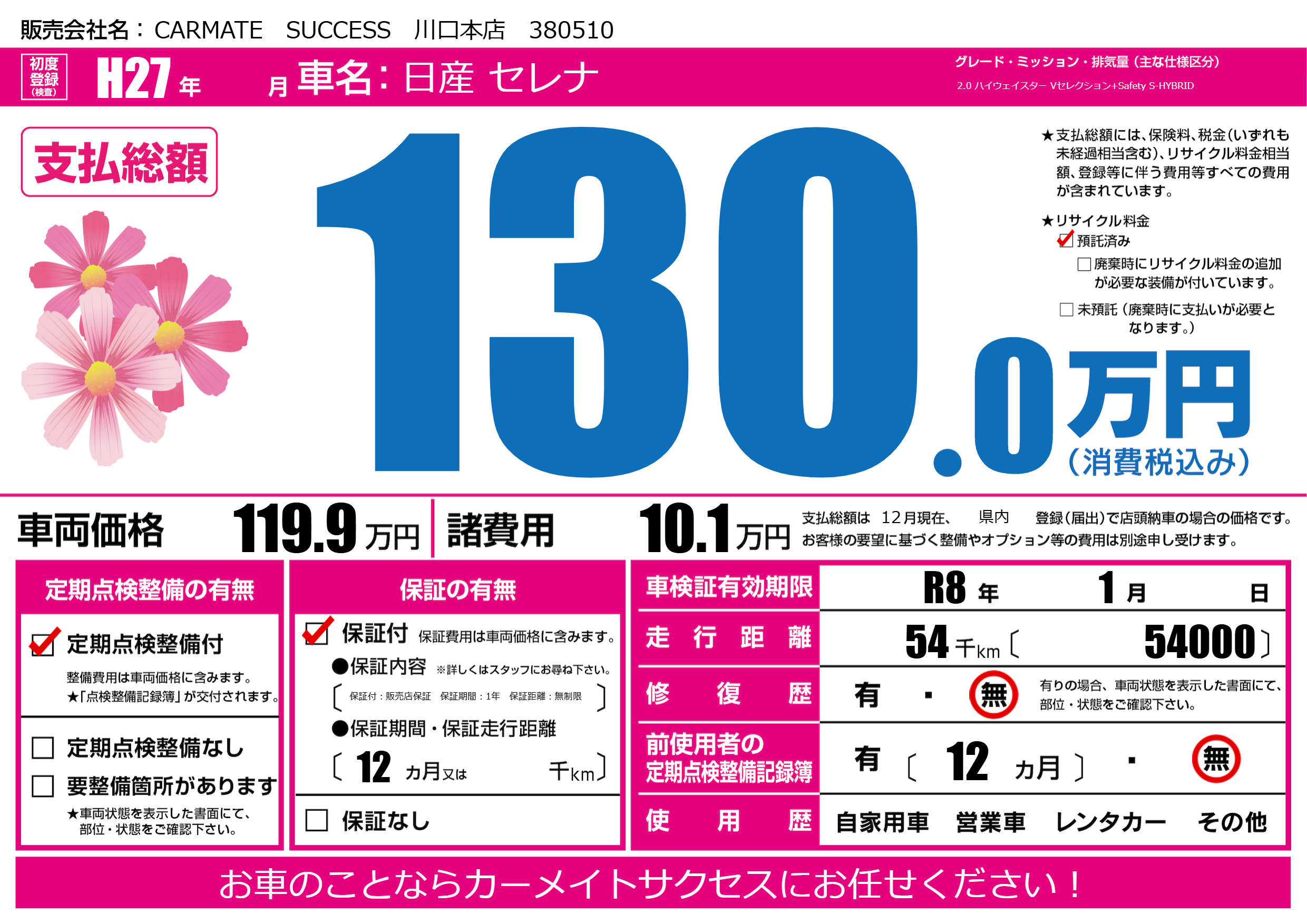 | 車名 | 日産 セレナ | グレード ミッション 排気量 |