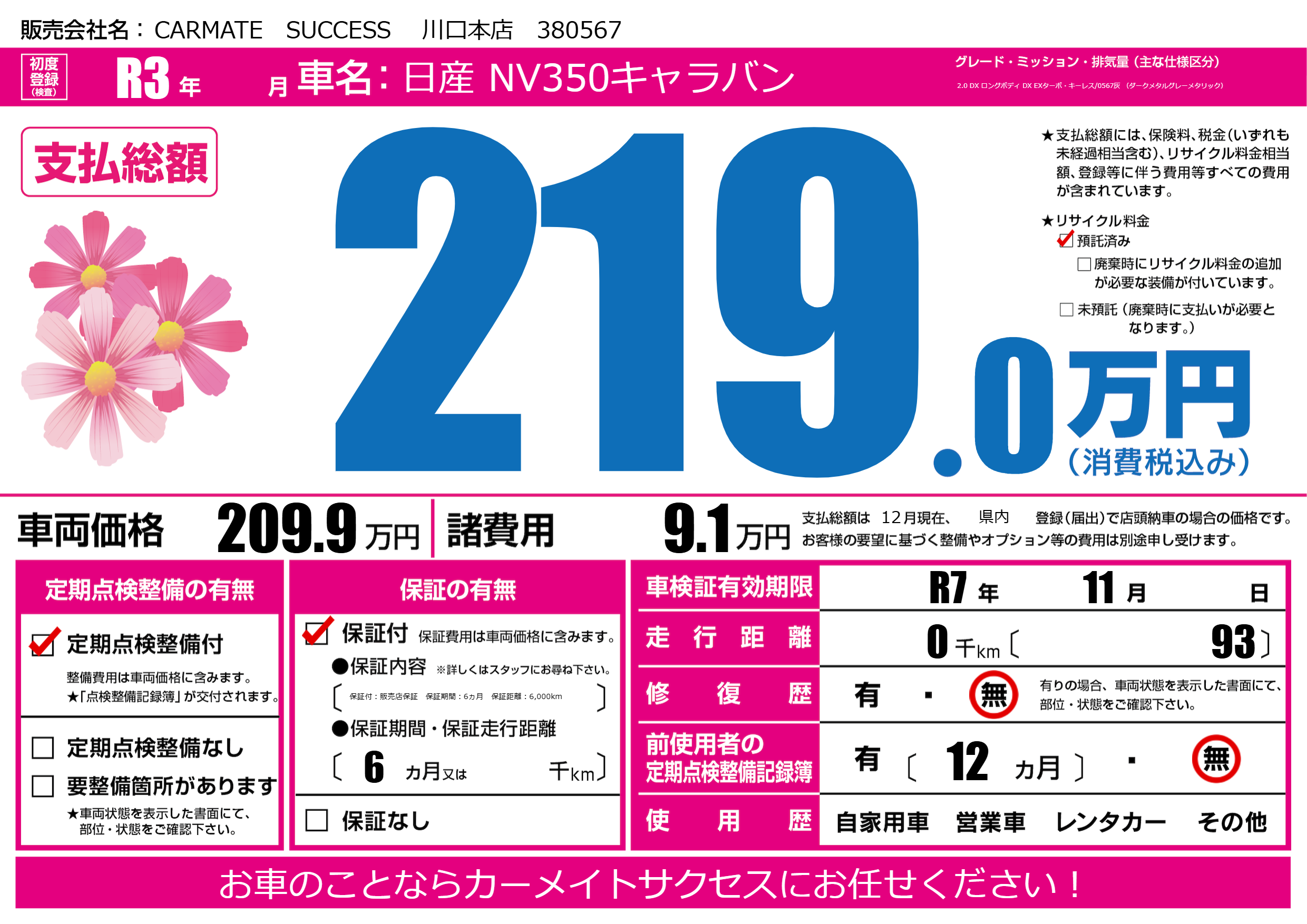 | 車名 | 日産 NV350キャラバン | グレード ミッション 排気量 |
