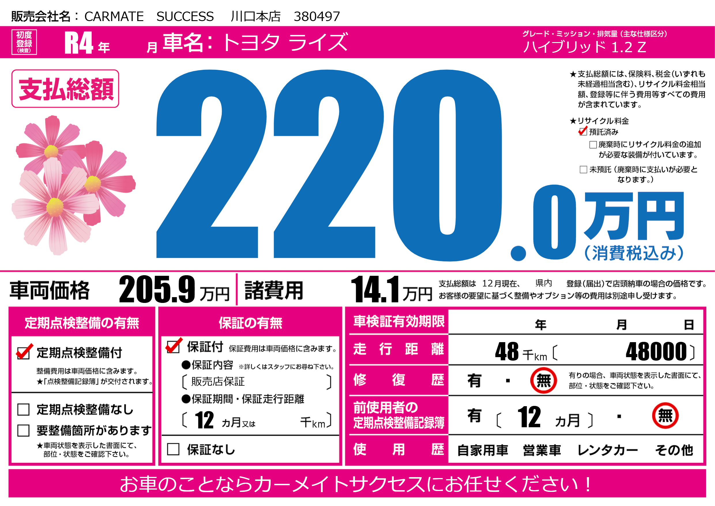| 車名 | トヨタ ライズ | グレード ミッション 排気量 |