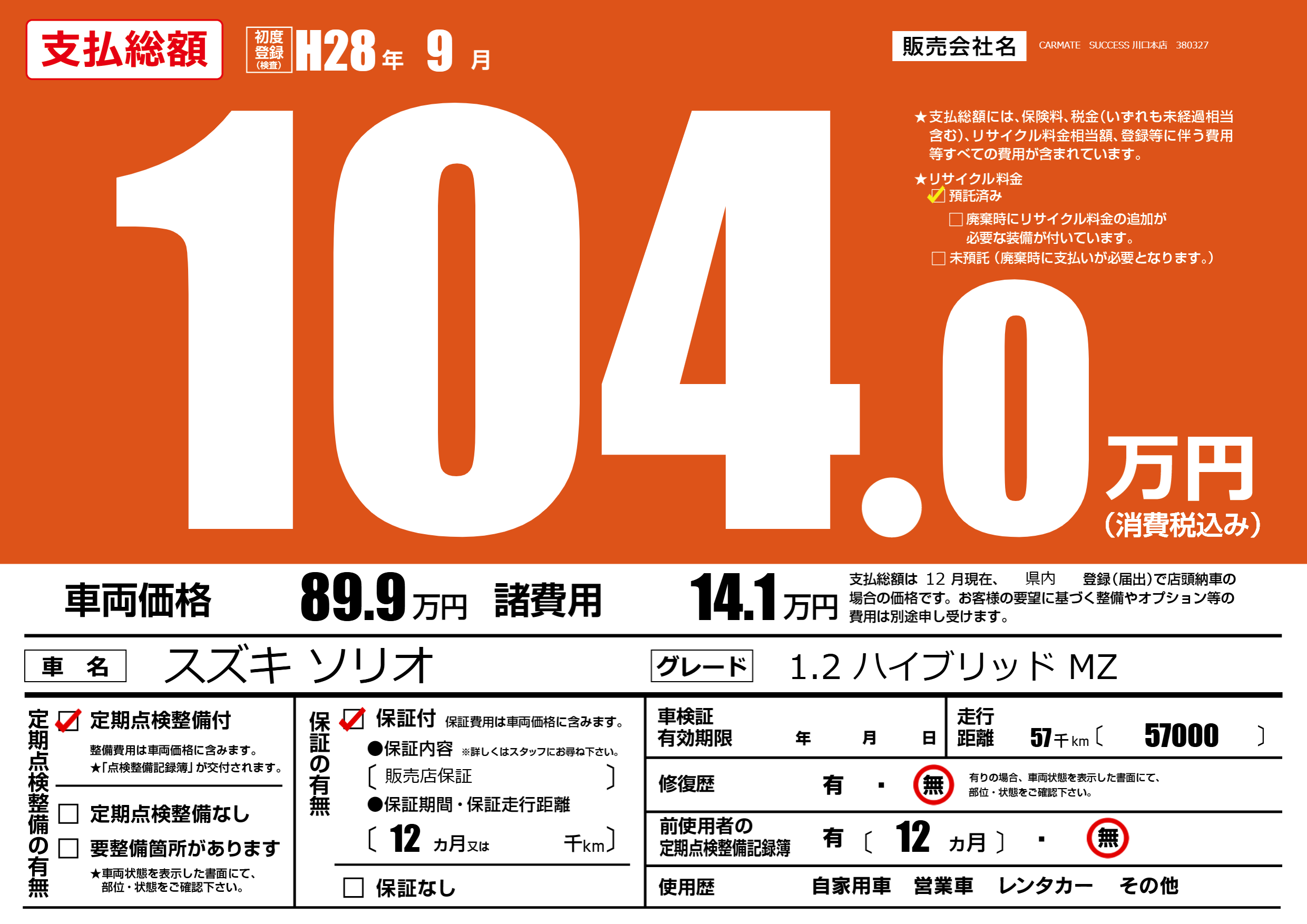 | 車名 | スズキ ソリオ | グレード ミッション 排気量 |
