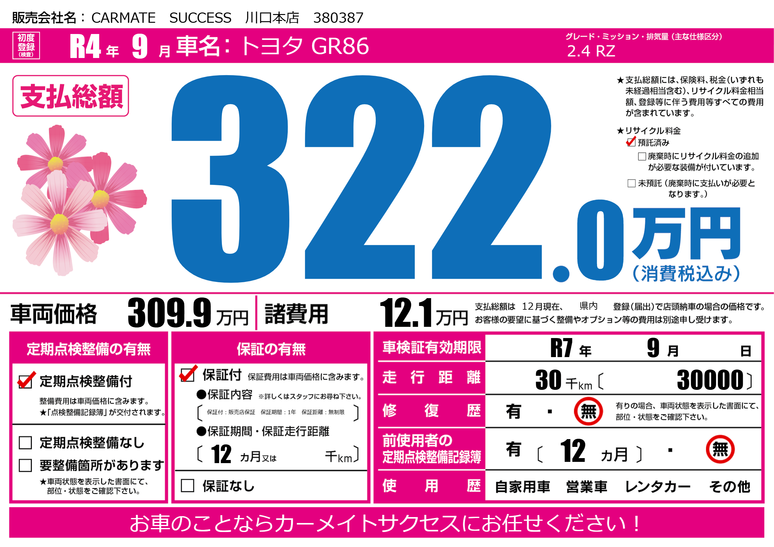 | 車検制限 | R7年 9月 - 日 | ||