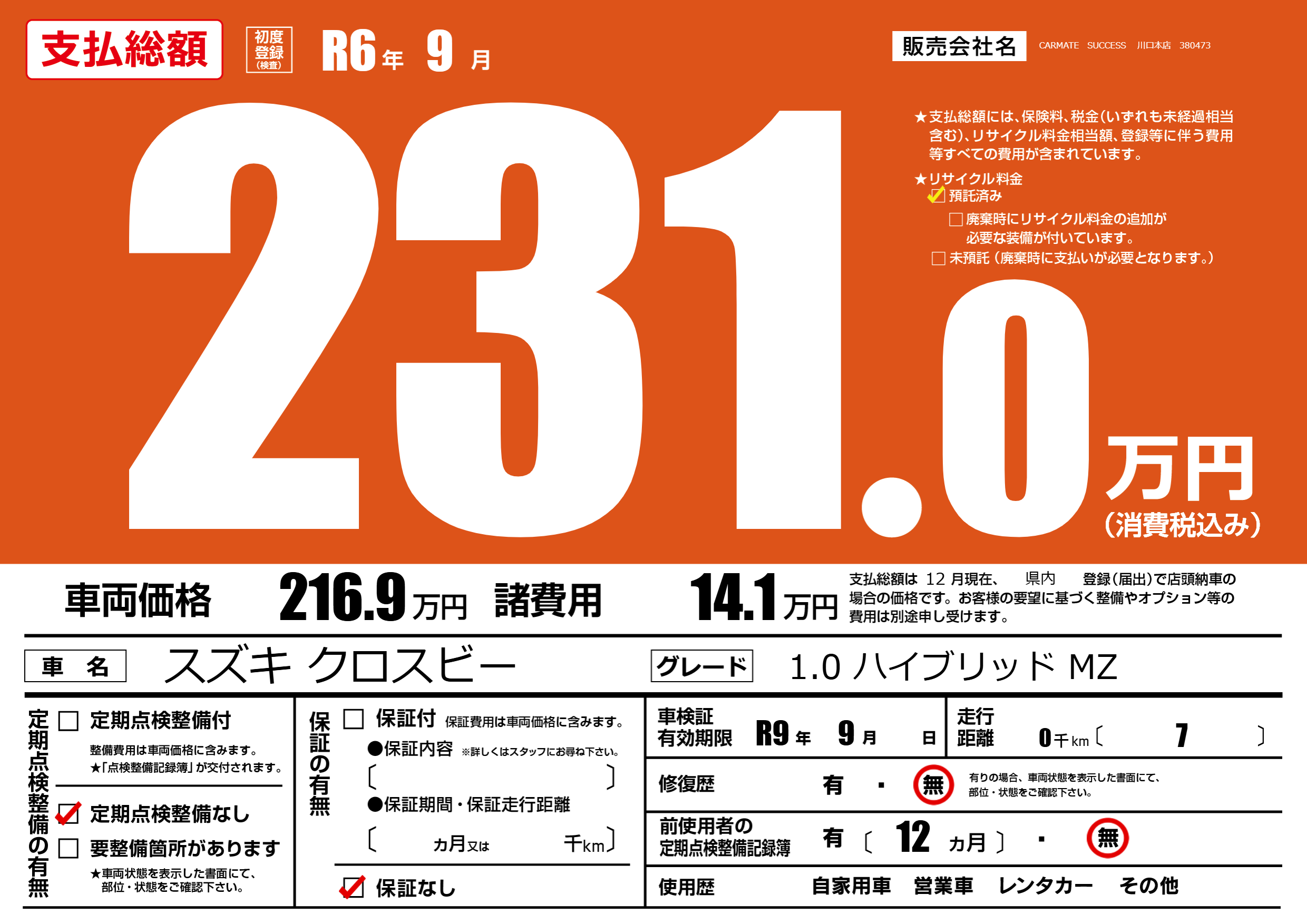 なし | 車検制限 | R9年9月---月 |
