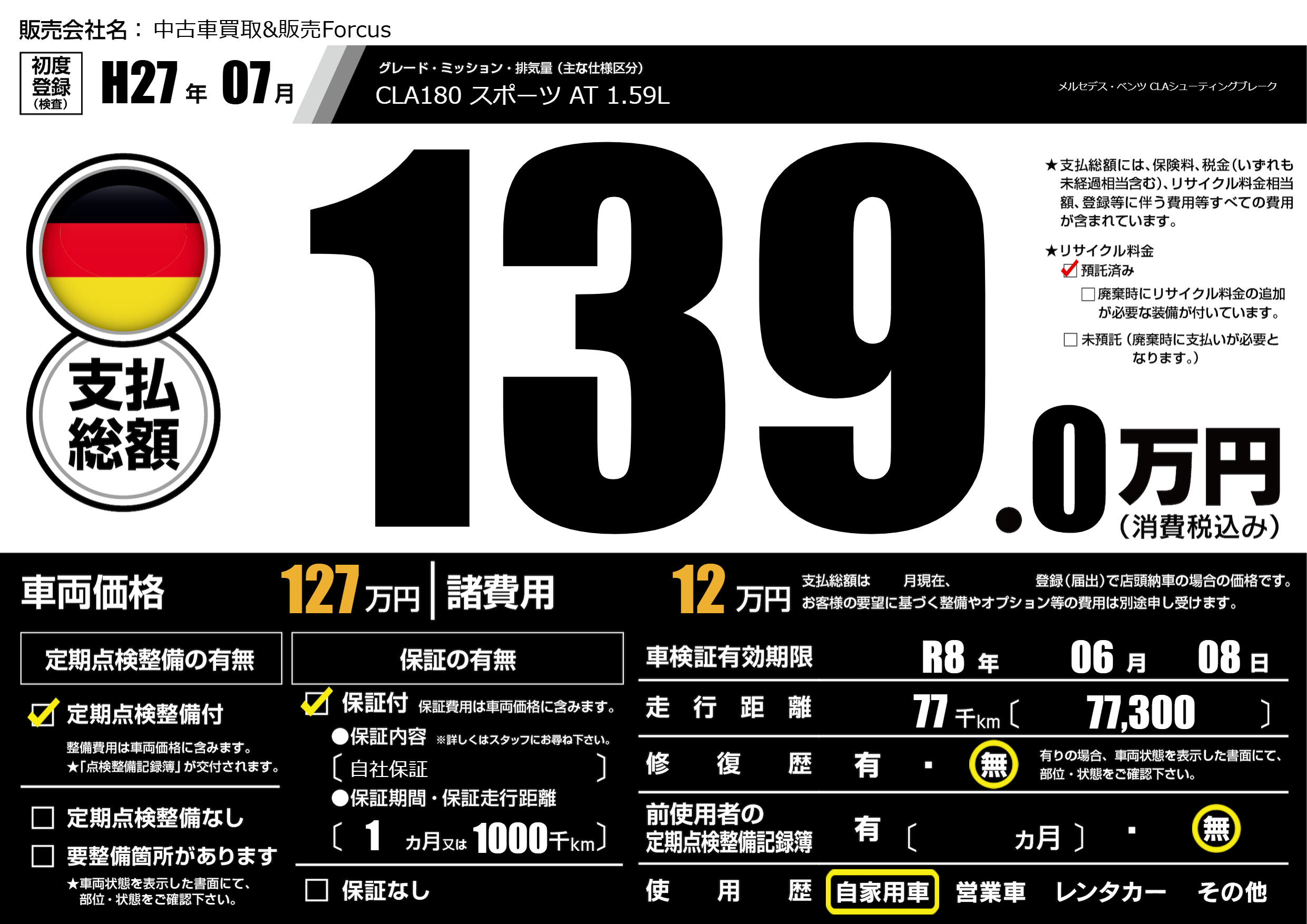 | 車名 | メルセデス・ベンツ CLAシューティングブレーク | グレード ミッション 排気量 |