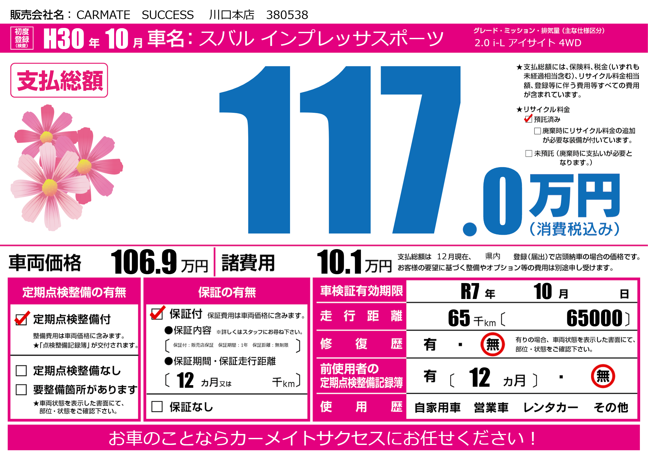 | 車名 | スバル インプレッサスポーツ | グレード ミッション 排気量 |