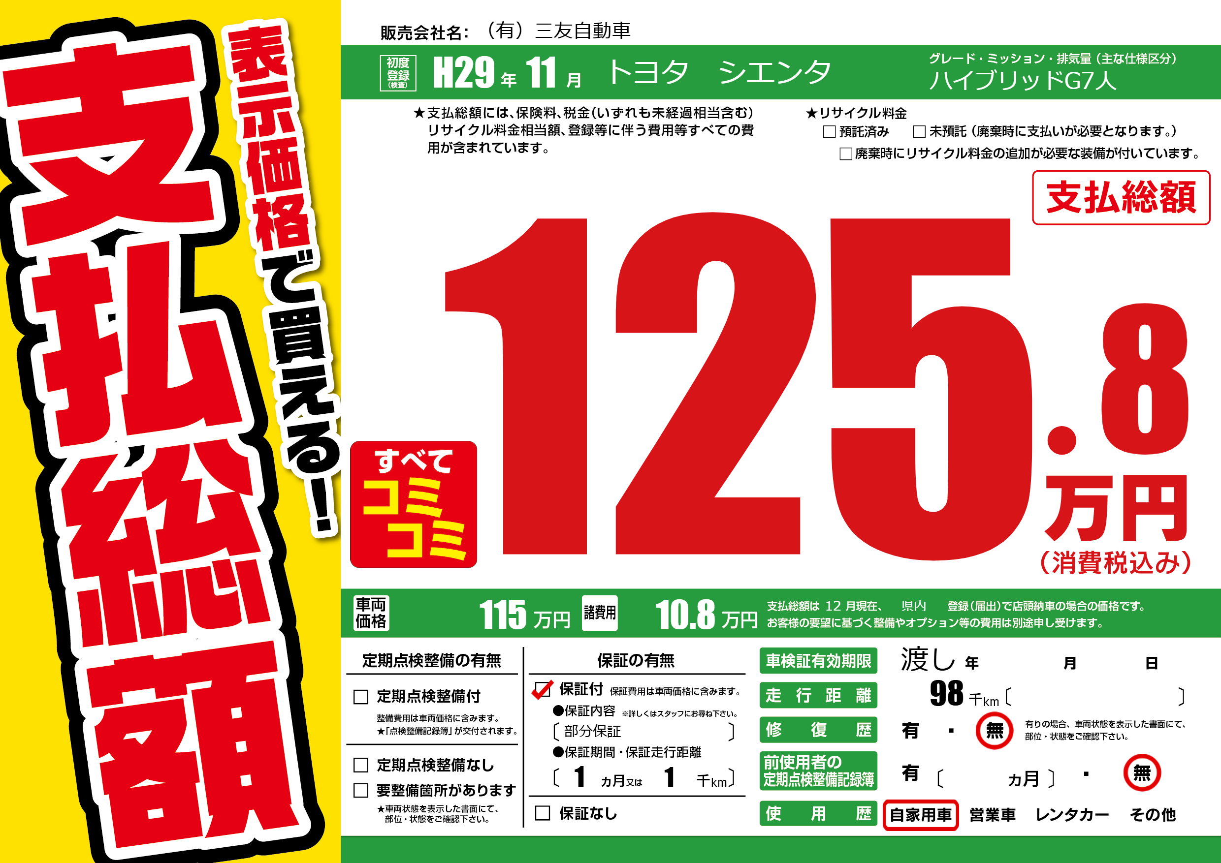 | 車名 | トヨタ シエンタ | グレード ミッション 排気量 |