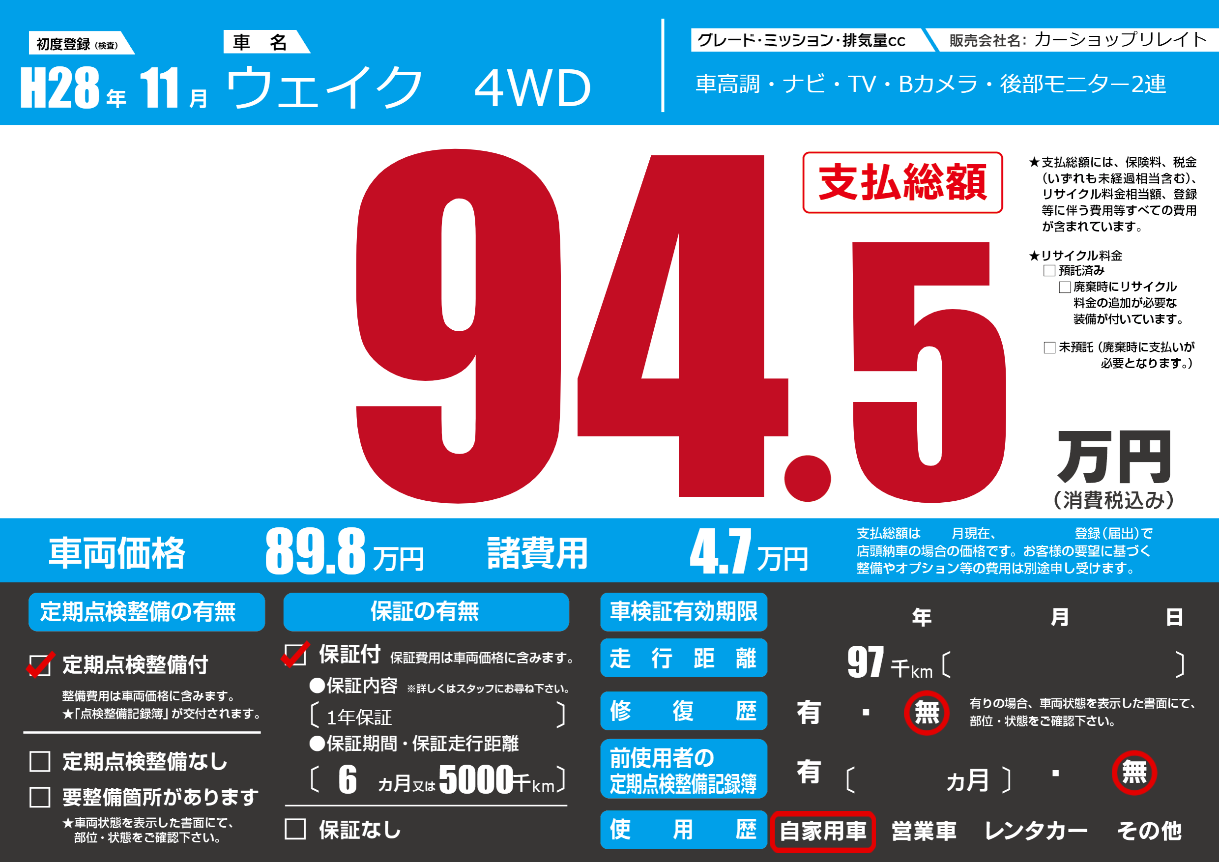 | 走行キロ | 9.7万km | 初年度登録 | H28年11月 |