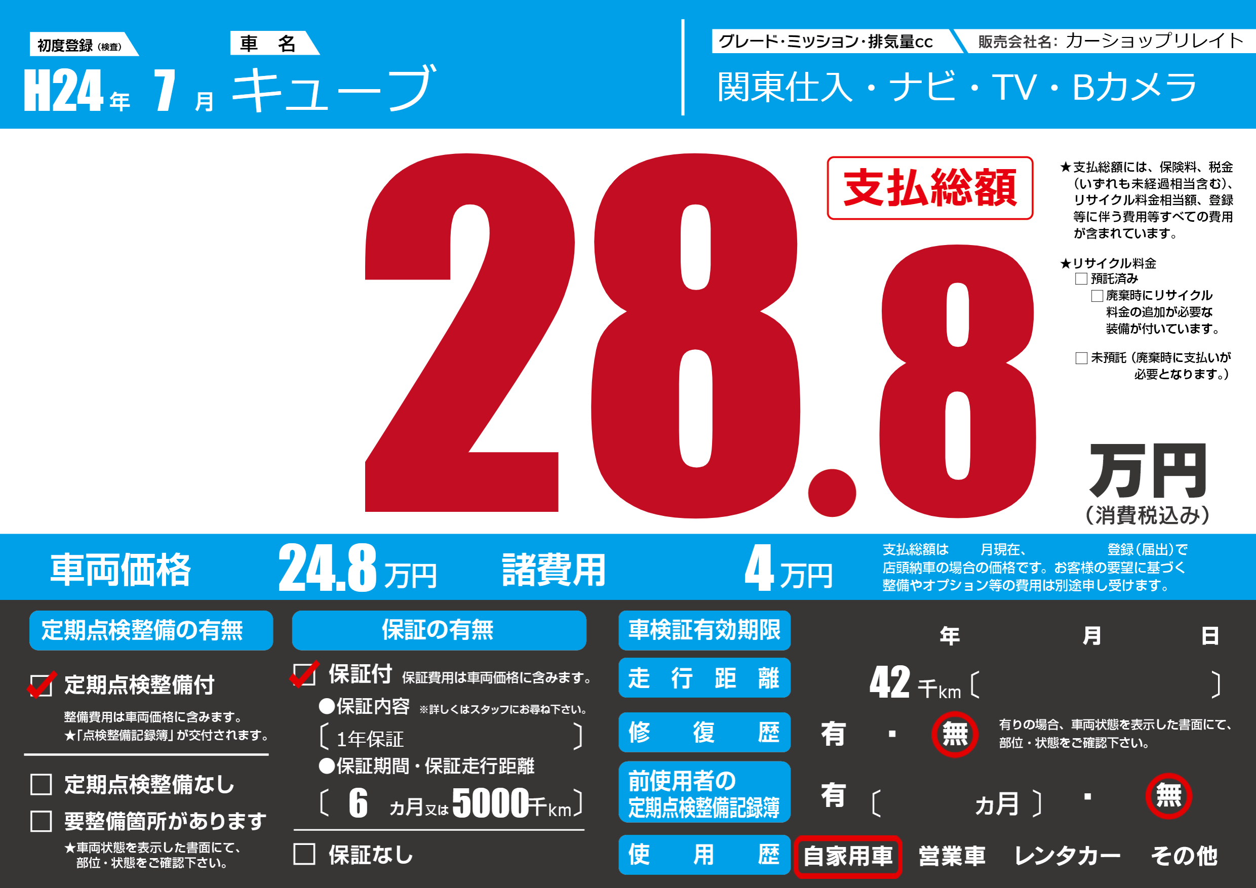 | 走行キロ | 4.2万km | 初年度登録 | H24年7月 |