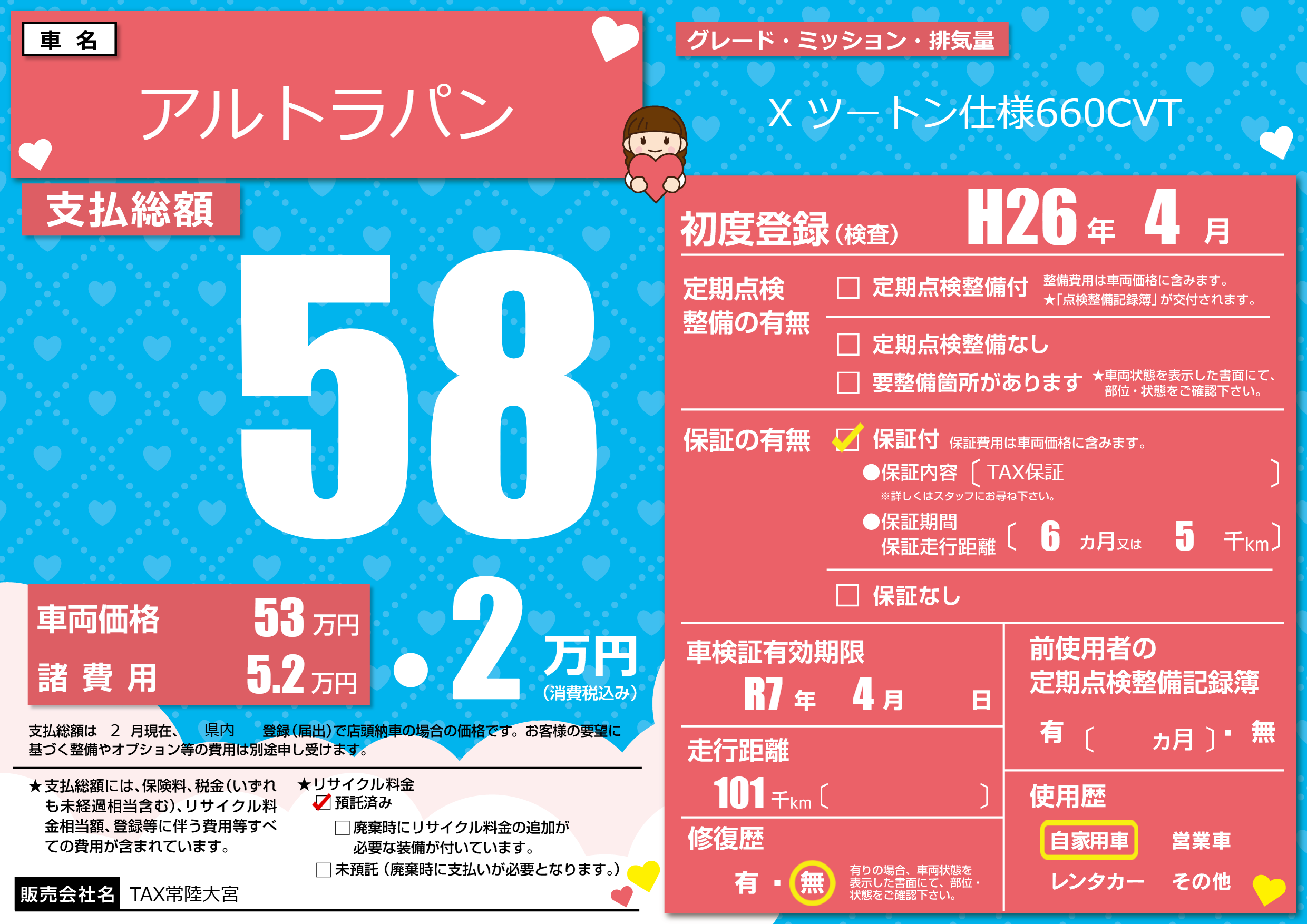 保証付き 保証内容(TAX保証) 6ヶ月または(5)千kmまで |