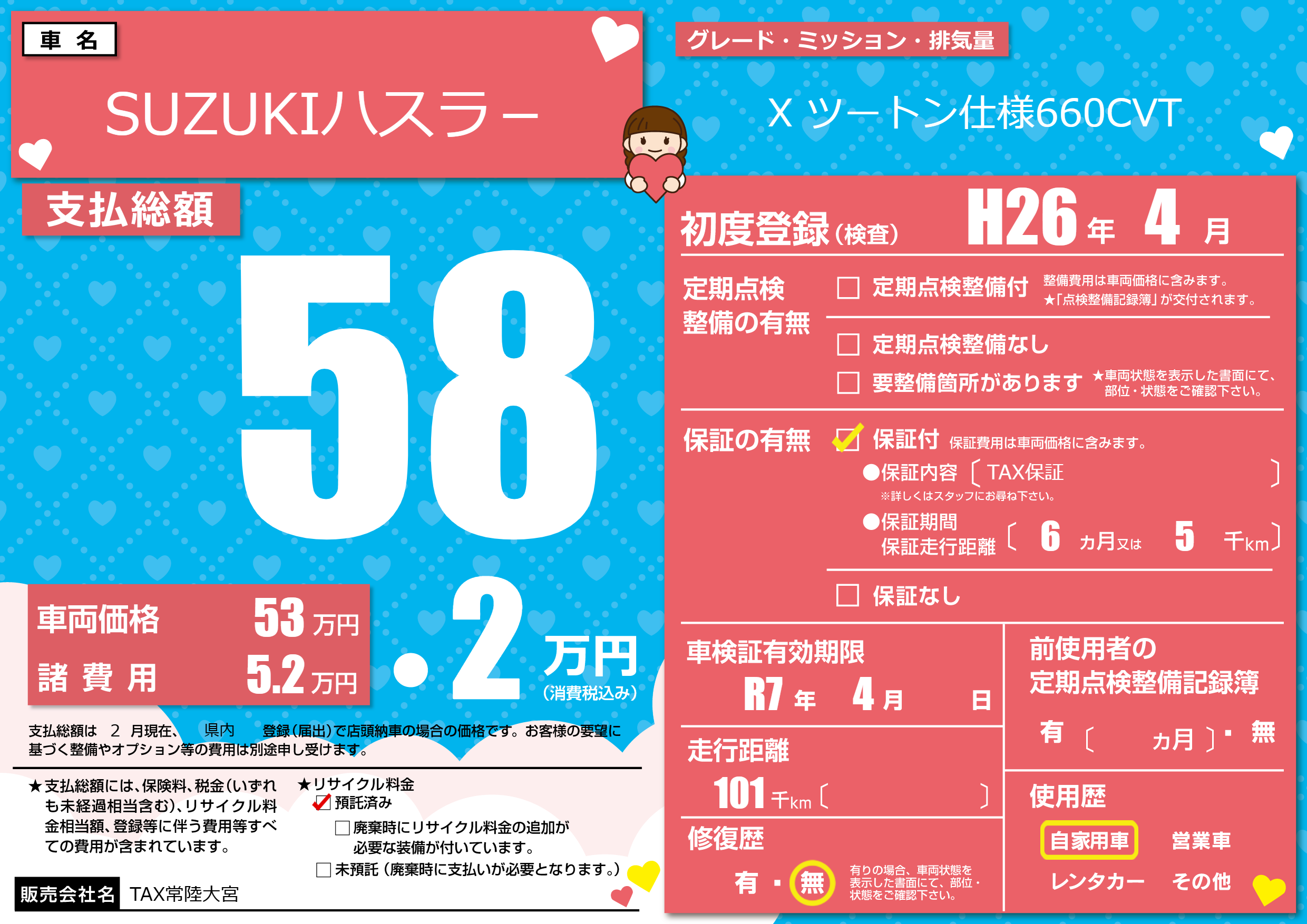 | 車名 | SUZUKIハスラ- | グレード ミッション 排気量 |