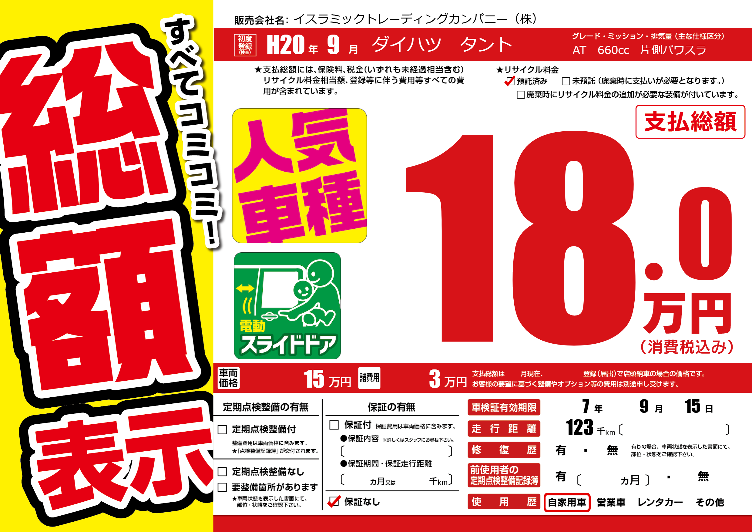 | 車名 | ダイハツ タント | グレード ミッション 排気量 |