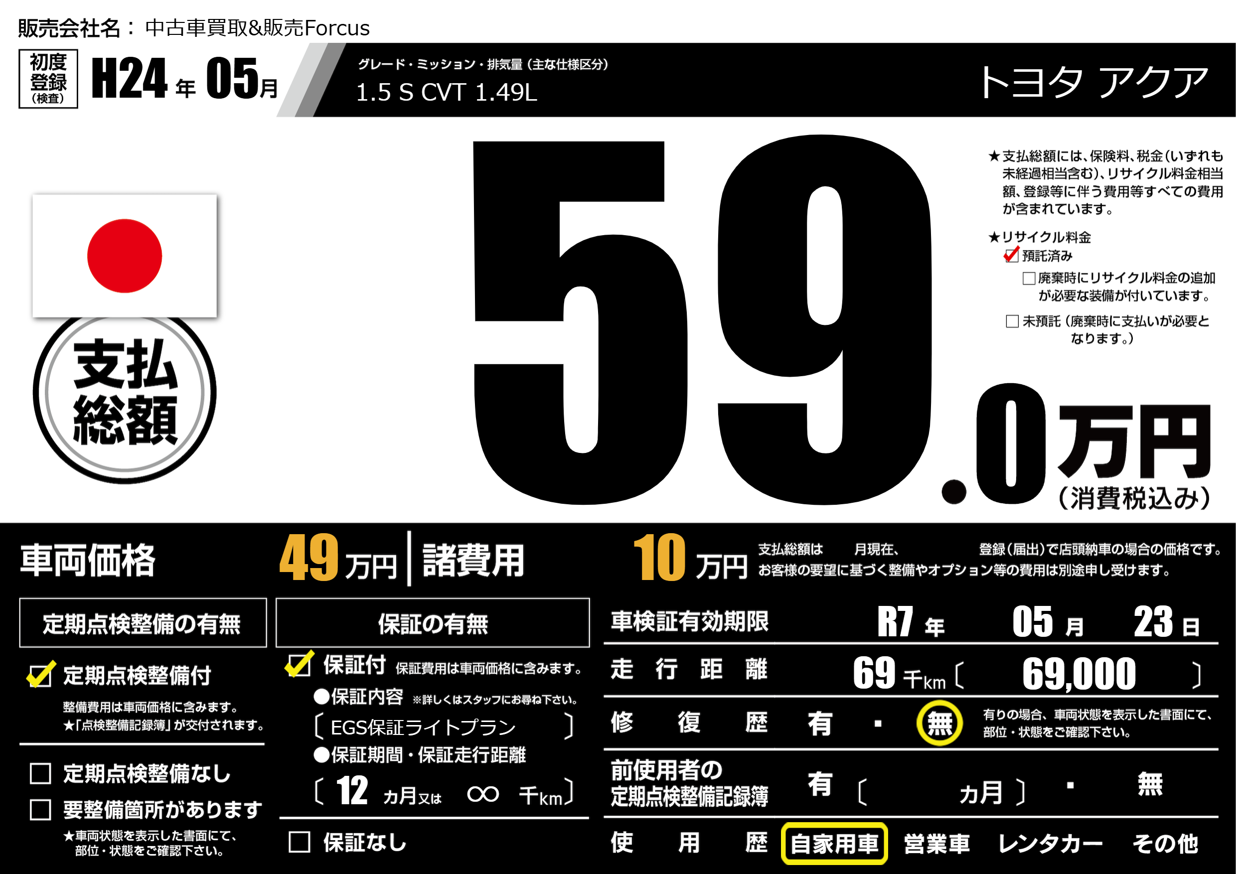 | 走行キロ | 6.9万km | 初年度登録 | H24年05月 |