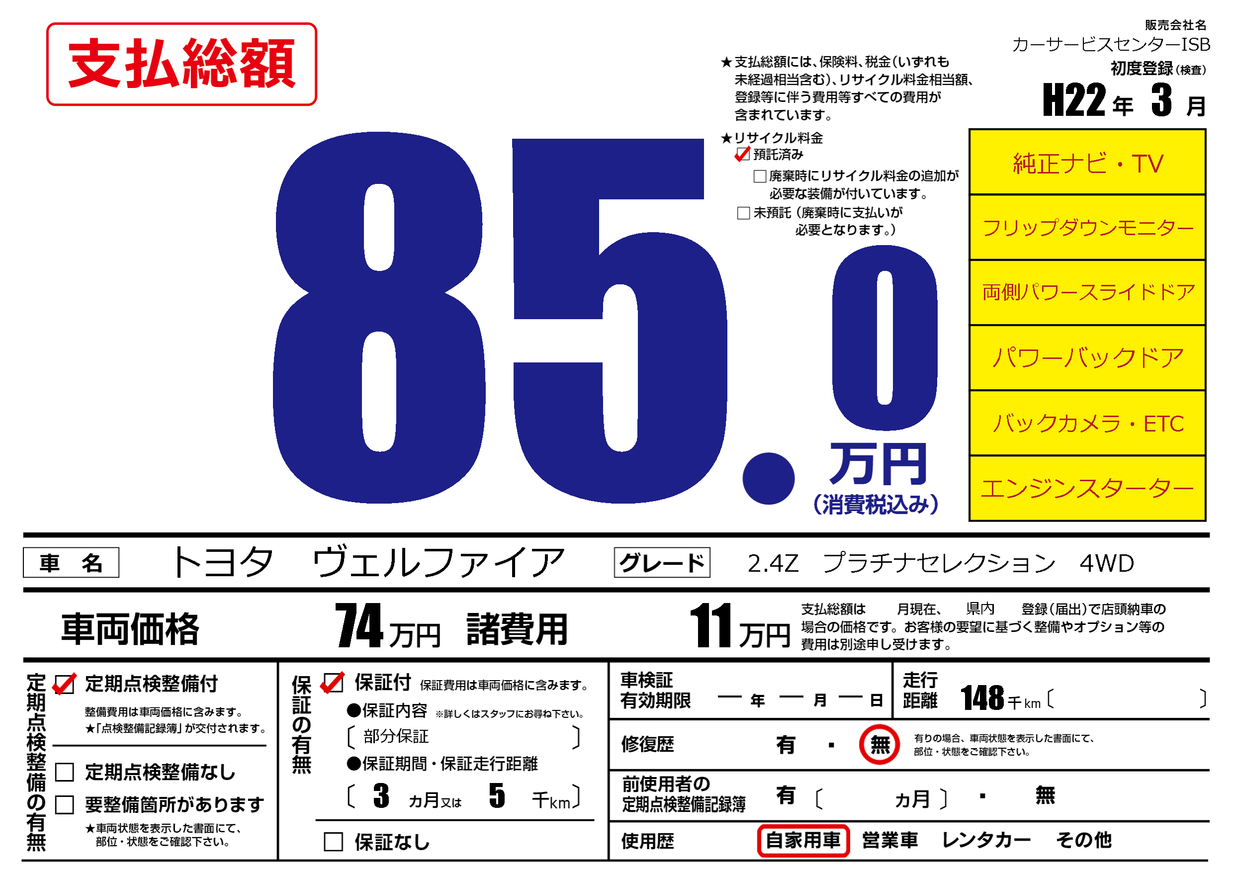 | 車名 | トヨタ ヴェルファイア | グレード ミッション 排気量 |